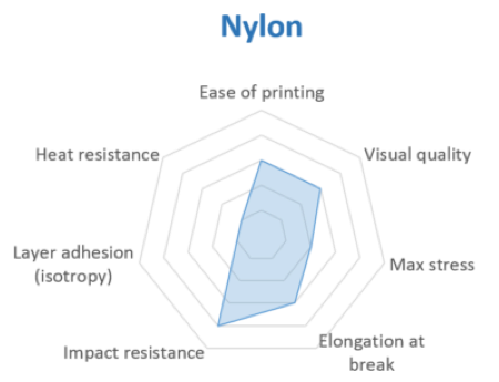Nylon possesses great mechanical properties, and in particular, the best impact resistance for a non-flexible filament. Layer adhesion can be an issue, however.