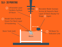 Stereolithography (SLA) process is based on light curing (photopolymerization) of liquid materials into a solid shape;n this process a vat of liquid polymer is exposed to controlled lighting (like a laser or a digital light projector) under safelight conditions. The exposed liquid polymer hardens. Polymerization occurs when photopolymers are exposed to light when photopolymers contain chromophores, otherwise, the addition of molecules that are photosensitive are utilized react with the solution to begin polymerization. Polymerization of monomers lead to cross-linking, which creates a polymer. Through these covalent bonds, the property of the solution is changed.[29] The build plate then moves down in small increments and the liquid polymer is again exposed to light. The process repeats until the model has been built. The liquid polymer is then drained from the vat, leaving the solid model.