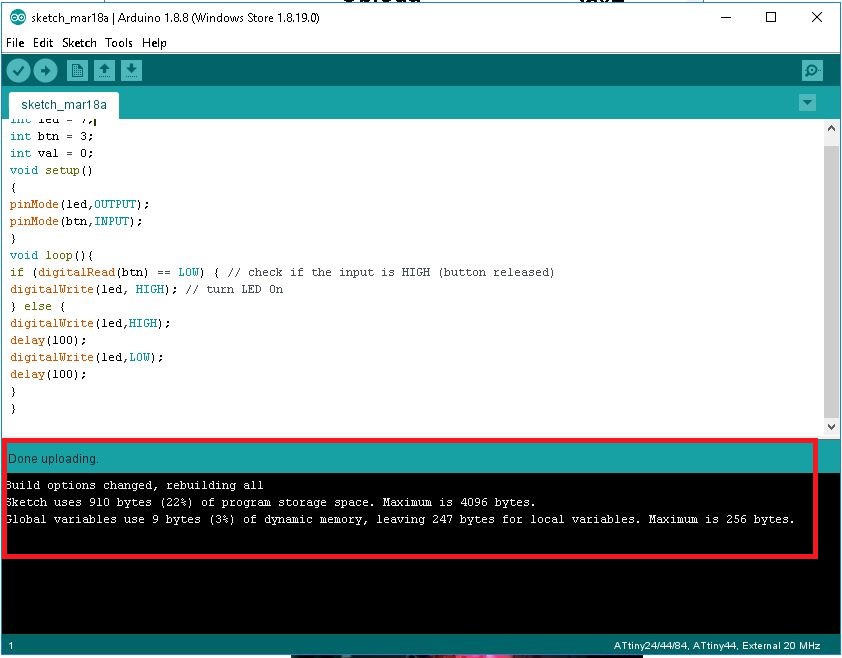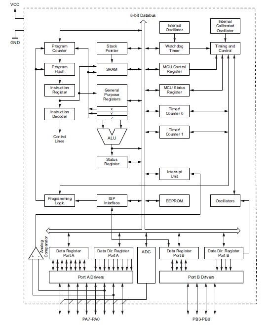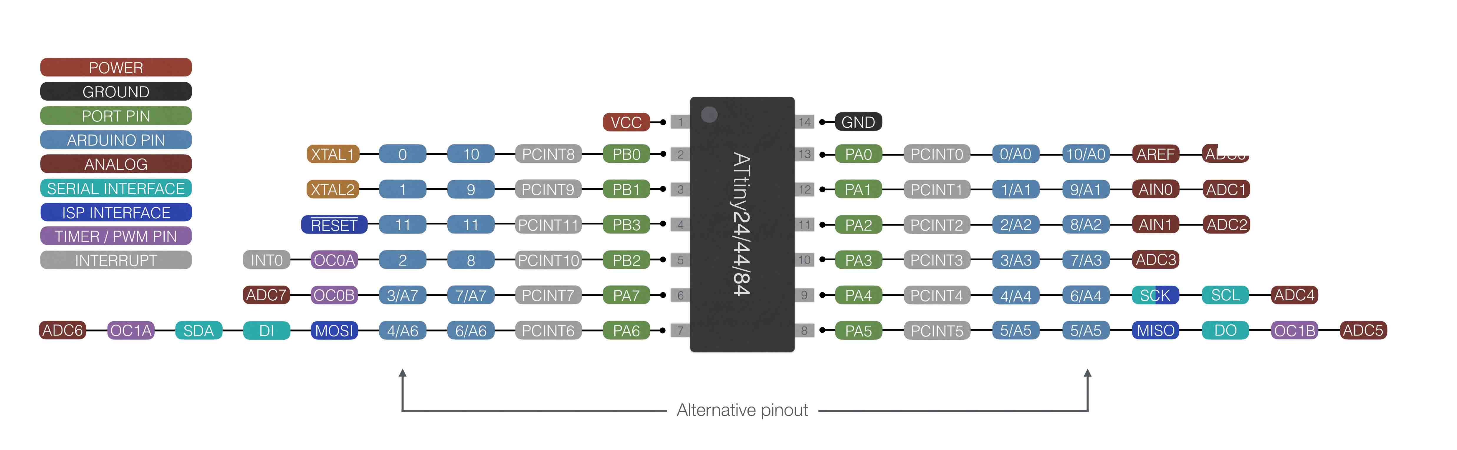 ATtiny (also known as TinyAVR) are a subfamily of the popular 8-bit AVR microcontrollers, which typically has fewer features, fewer I/O pins, and less memory than other AVR series chips. ATTINY 44 is 16 pin 8bit microcontroller.The ATtiny44 is a high-performance, low-power Microchip AVR RISC-based CMOS 8-bit microcontroller.It combines 4KB ISP flash memory, 256-Byte EEPROM, 256B SRAM, 12 general purpose I/O lines .The ATtiny44 consistof 32 general purpose working registers, an 8-bit timer/counter with two PWM channels, a 16-bit timer/counter with two PWM channels, internal and external interrupts, an 8-channel 10-bit A/D converter and a programmable gain stage (1x, 20x) for 12 differential ADC channel pairs. It has a programmable watchdog timer with internal oscillator.The a internal calibrated oscillator and three software selectable power saving modes makes it suitable for small embedded products . By executing powerful instructions in a single clock cycle the device achieves throughputs approaching 1 MIPS per MHz .It also balance power consumption and improve processing speed.