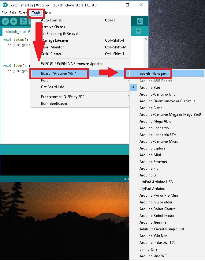 Now to set up the attiny boards, Go to "Tools". Then you can see "Boards". Then click "Board Manager"