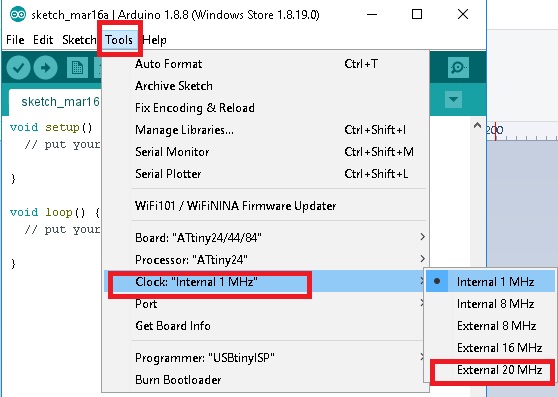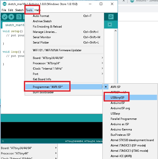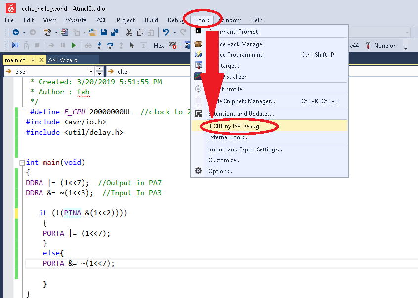 Now it is compailed. We have to upload into the board. For that go to "Tools" again and click "USBTiny ISP Debug":