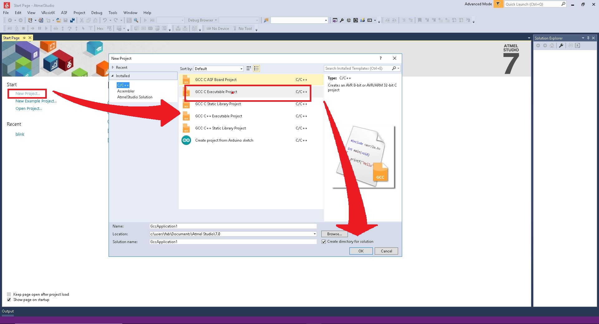 For programming first install and open ATMEL STUDIO. Click "New Project" and srlect"GCC C Exictable project". Click ok to confirm the selection