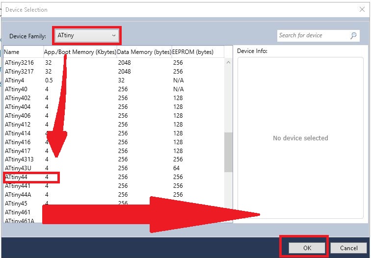 Now you can see the following window. Select device famiy as Attiny and select Attint 44. Click ok to confirm the operation.