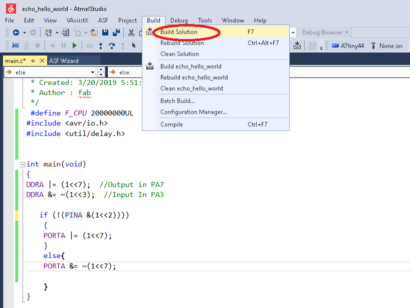 Now for testing the board, Open "Build" from the menu and click "Build solution"