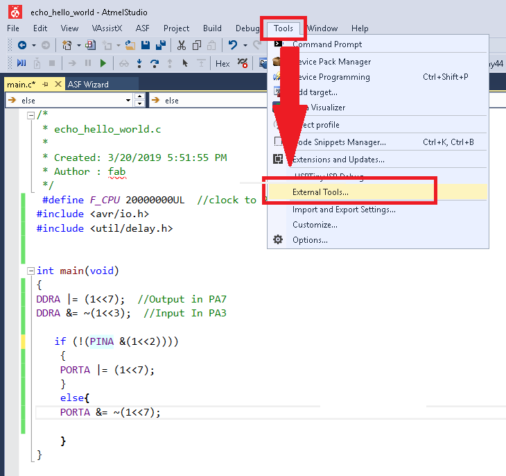 Now we need to setup some parameters for usbtiny debugging. For that Go to "Tools" and Select "External Tools..."