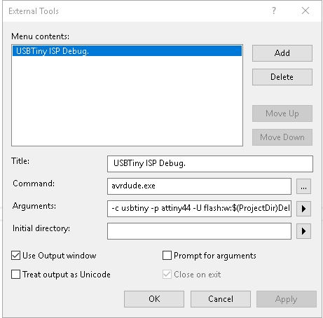 Arguments :- -c usbtiny -p attiny44 -U flash:w:$(ProjectDir)Debug\$(TargetName).hex:i
