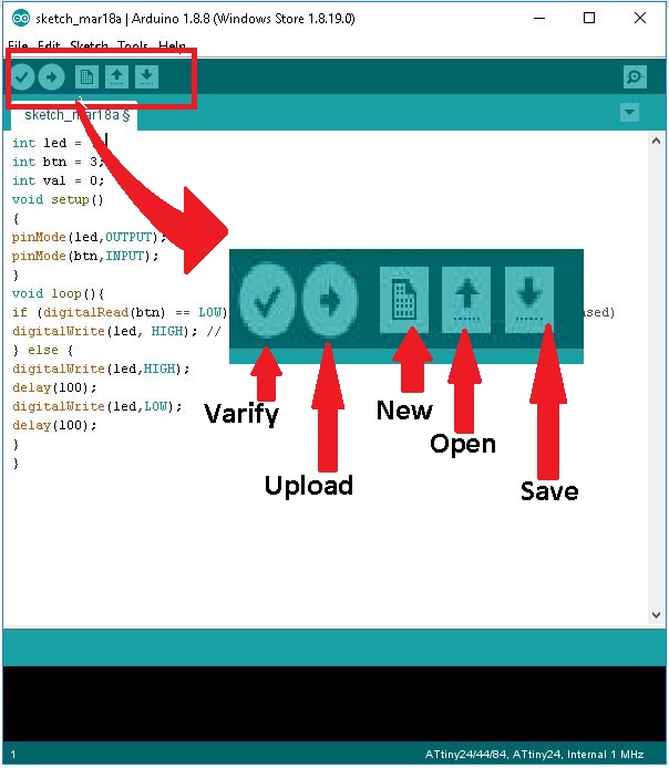 Copy and paste the code into Arduino IDE. The main buttons on top are listed below. Save and varify the the code for errors