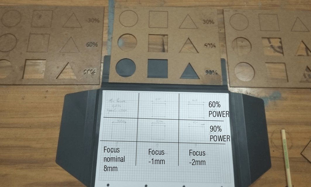 As a first characterization test we cutted circles, squares and triangles at different powers and focus. The test material is mdf-like and around 2.3mm thick. I measured the outside square width and forgot (I take the responsibility of the group for it) to measure the inside square width. So we had to perform another test. Anyway, the first test gave us the oppurtunity to witness that the best focus is at 6mm. Indeed, the best cut and the best square precision (outside square width=5.0mm) is for 90% at a focus of 6mm.