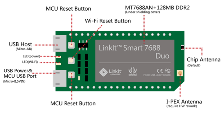 LinkIt Smart 7688 Duo is an open development board compatible with Arduino Yún sketches, based on the OpenWrt Linux distribution, MT7688 and ATmega32u4. The board is designed especially to enable the prototyping of Rich IoT Application for smart house or office. Since it is compatible with Arduino, this allows you to use different features from Arduino Yún and LinkIt Smart 7688 Duo, which will help you build rich applications based on various, robust and compiled Arduino Yún sketches. The board offers you the memory and packet storage to enable robust video processing. The platform also offers options to create device applications in Python, Node.js and C programming language.