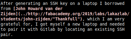 After generating an SSH key on a laptop I borrowed from John Howard van der Zijden, which I am very grateful for, I got myself a new laptop and needed to pair it with Gitlab by locating an existing SSH pair.