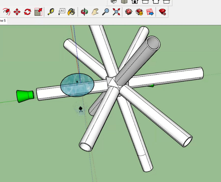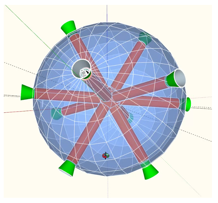 As I was skeching I got the idea to first find a mechanism to maneuver a water rocket with the same precision as the Lockheed Martin’s Multiple Kill Vehicle. So I came up with a concept to change the output direction as fast as possible from thruster to thruster within a certain timeframe. To test the maneuverability of the system, I simplified the mechanism to a spherical designed water rocket that can aplie countertrust without losing waterflow:¶