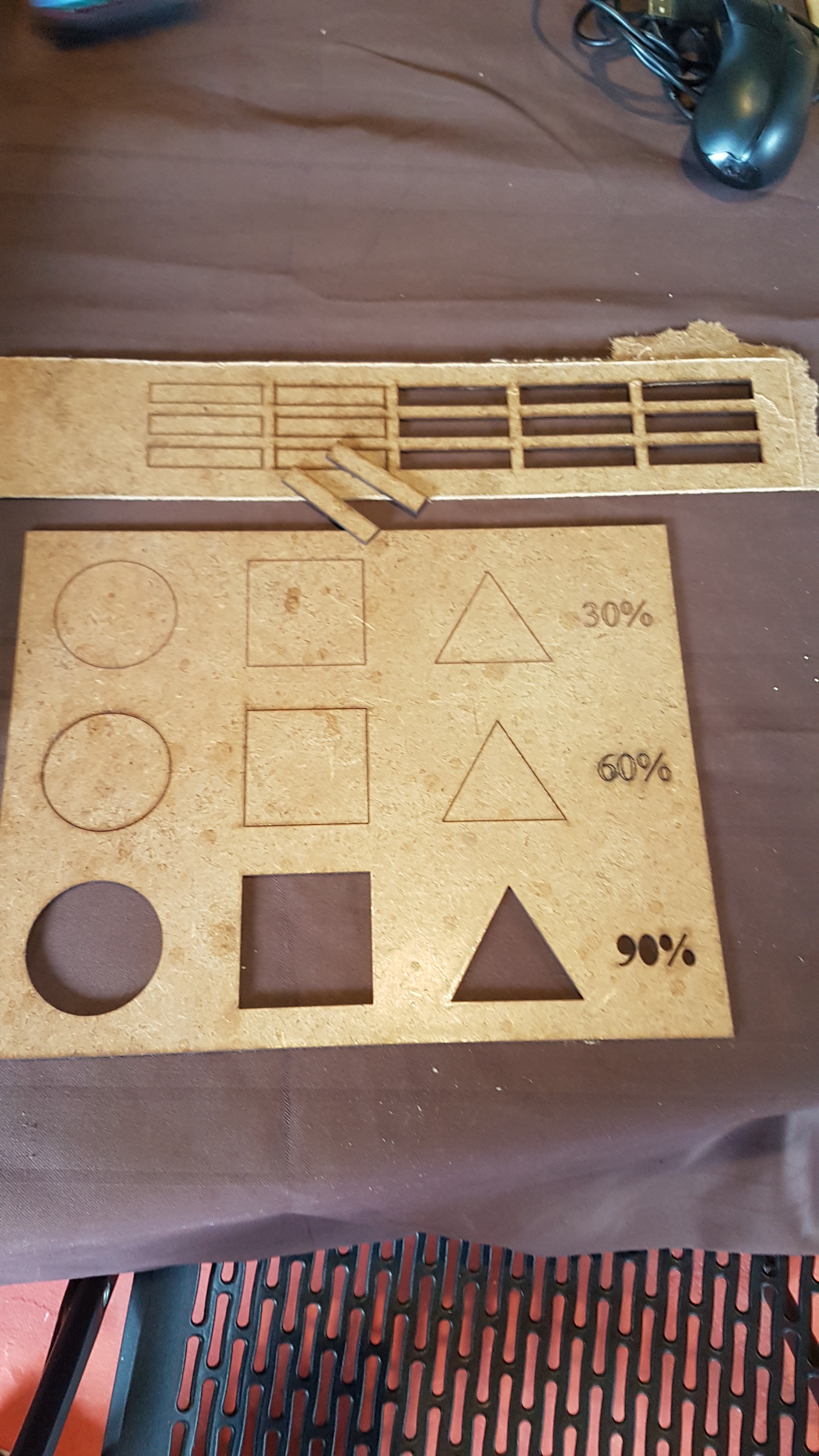 The first test was to cut circles, squares and triangles at different powers and focus using a mdf-like material with a thickness around 2.3mm. We used
