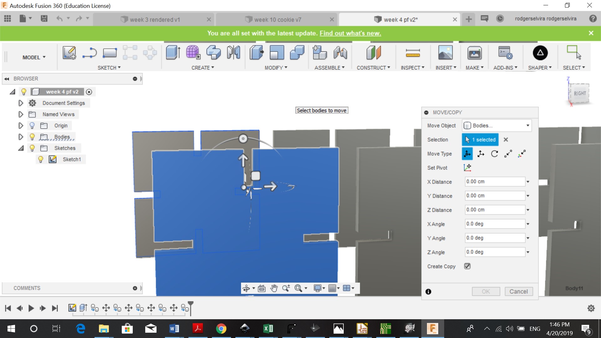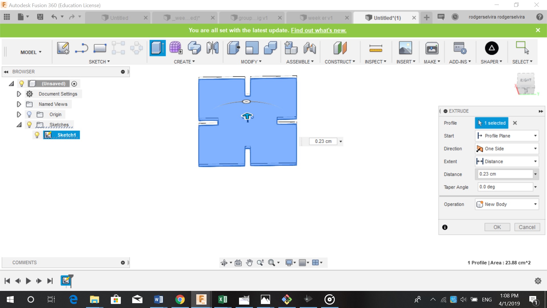 After sketching the design I extruded it by 0.23 cm. And made multiple copies of the design by clicking on move/copy. You can select the body and click on make copy. You can move the copy of the body using the square inf front of it.