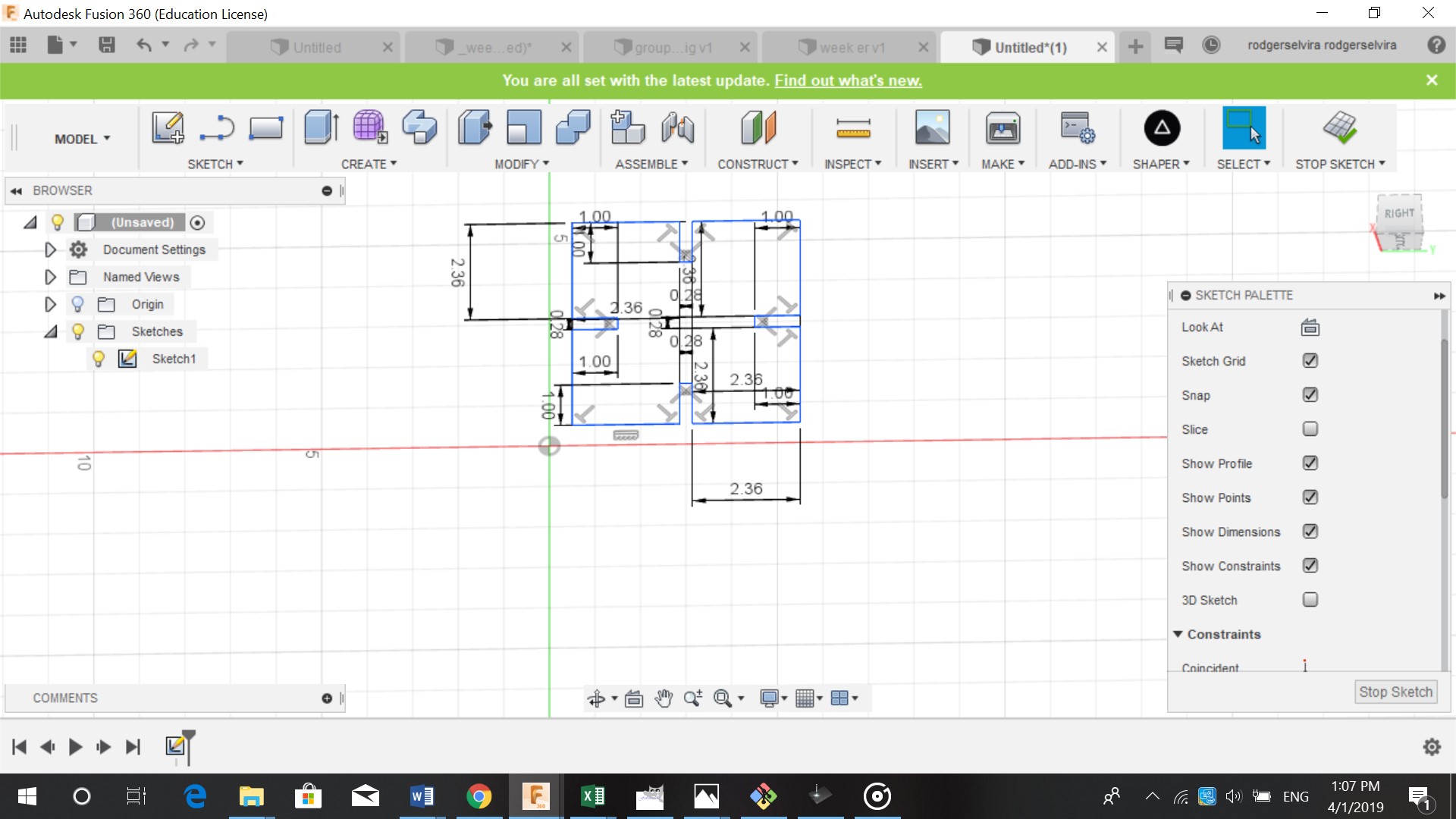 For the individual assignment we had to create a press fit construction kit. For this assignment we used cardboard with a thickness of 2.3 mm. I designed the pieces in Fusion 360. I started out making a sketch, I used 5 cm by 5 cm for the pieces. For the pieces to fit into each other I made a kerf in the middle of 1 cm by 0.23 cm. The width of the kerf is the same as the thickness of the material because t has to fit.