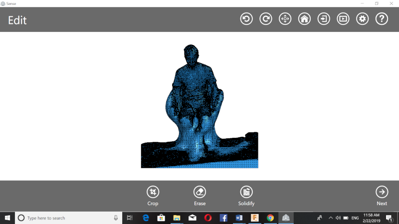 To start scanning we had download the Sense setup. Before using Sense we had to enter a code (5204) to let it start working. We connected the scanner to our laptop using the USB cable and taped the scanner to the back of our laptop to work more efficient. We decided to make a full body scan of one another and it took a few times beacuse the scanner lost the image. To get the best results the person must be scanned two times and in the end the scanner should be held over teh head to get the form of the head fully. After you are done with scanning you follow these steps