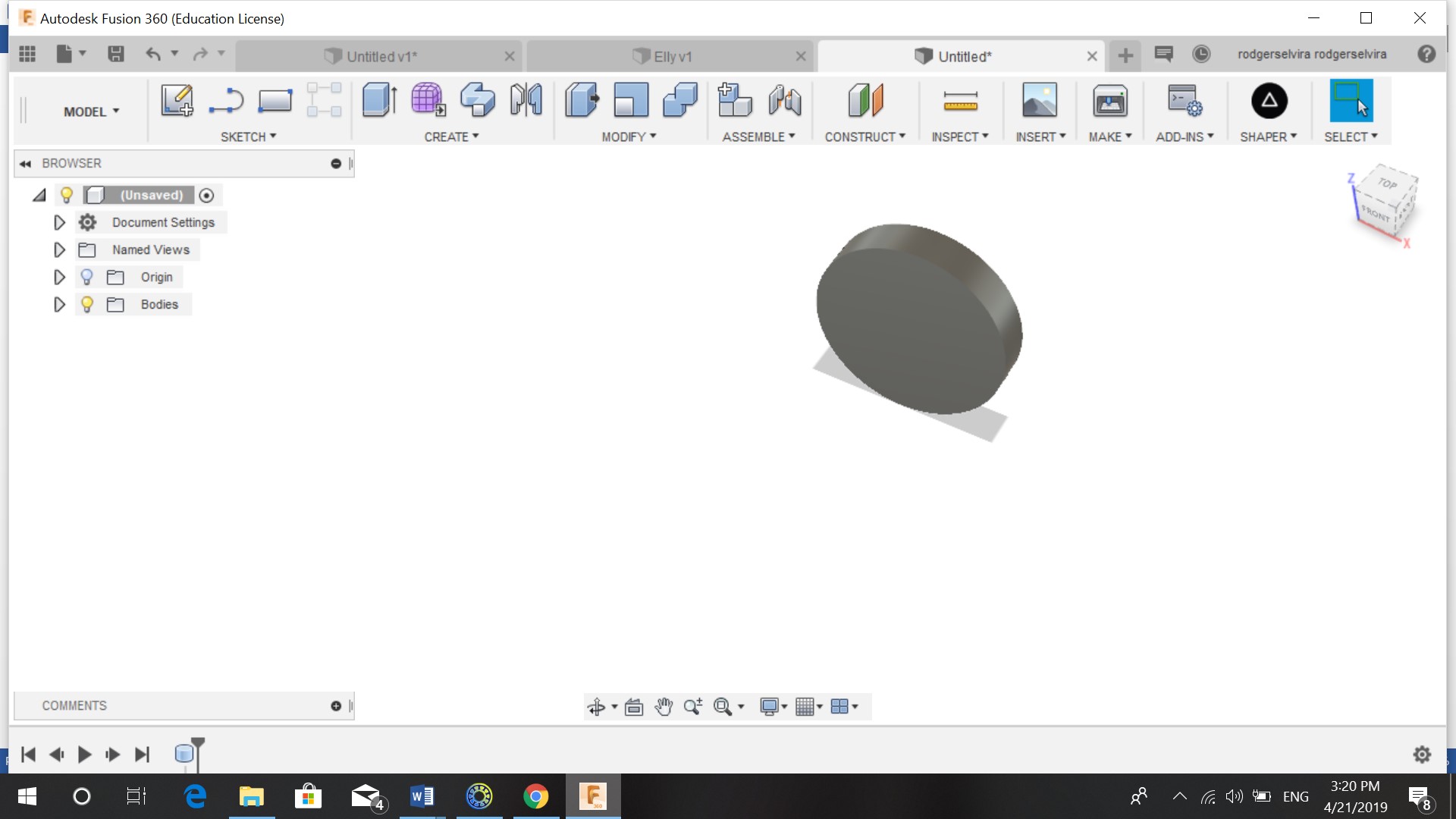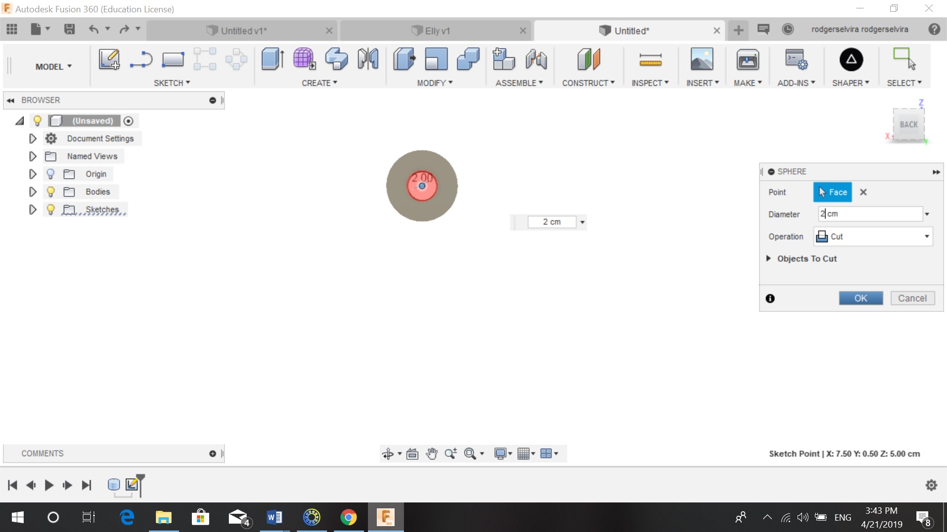 Choose Cylinder (under create list), diameter= 5 cm, height= 0.5 cm
