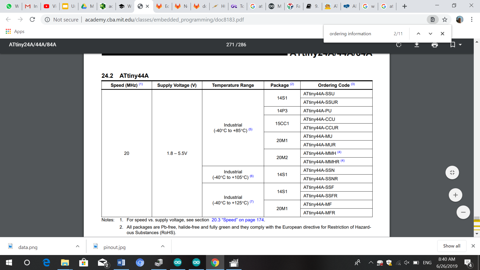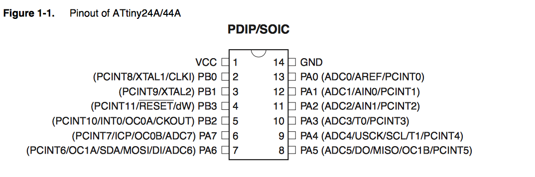 The packaging of the Attiny44 can be different. All of the types though have a maximum speed of 20 MHZ. Can take a maximum voltage of 5.5 V. If you go over this voltage your controller will short cirquit. The Attiny 44 that was used this week has a temperature range between -40°C to +85°C.