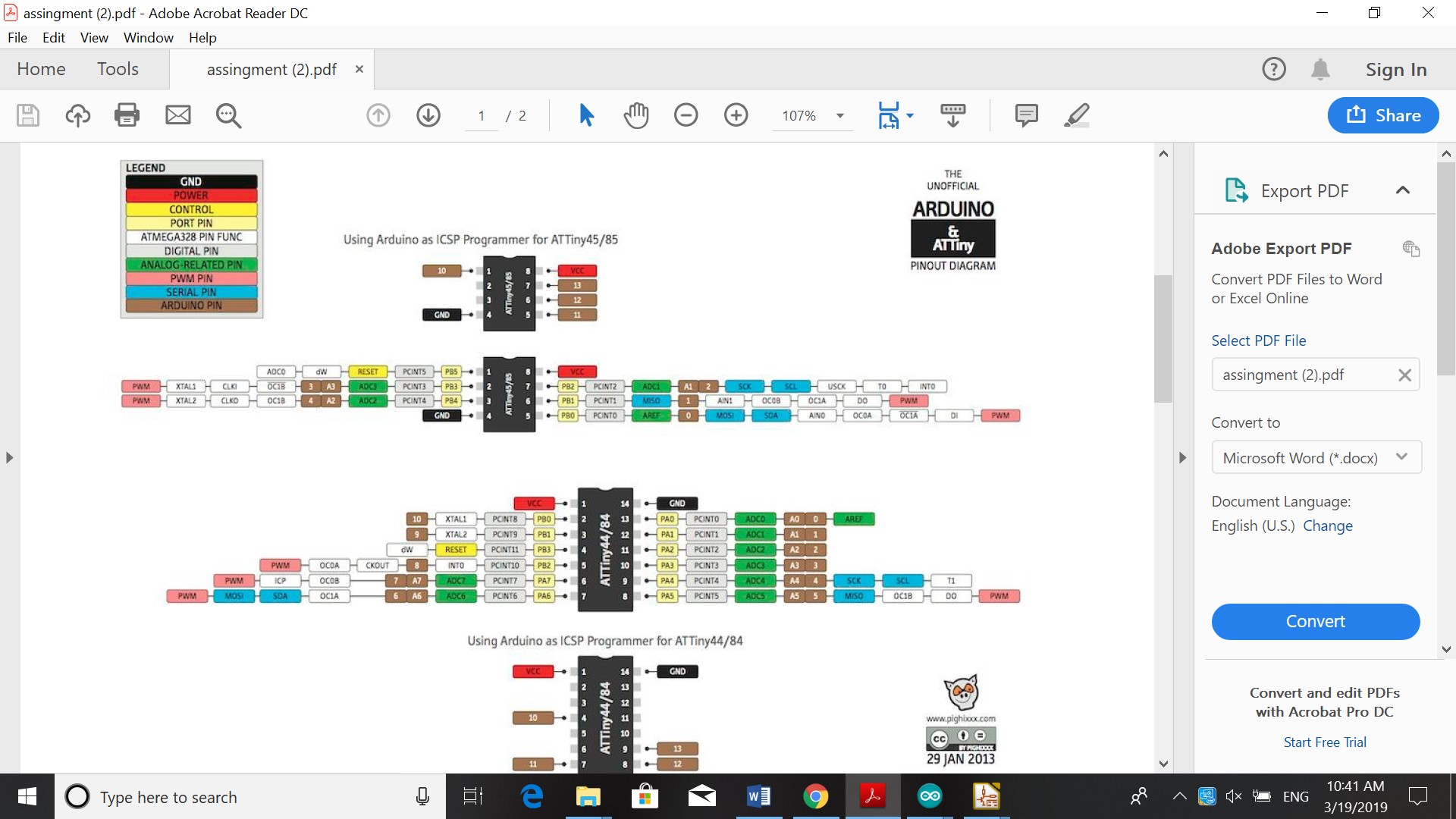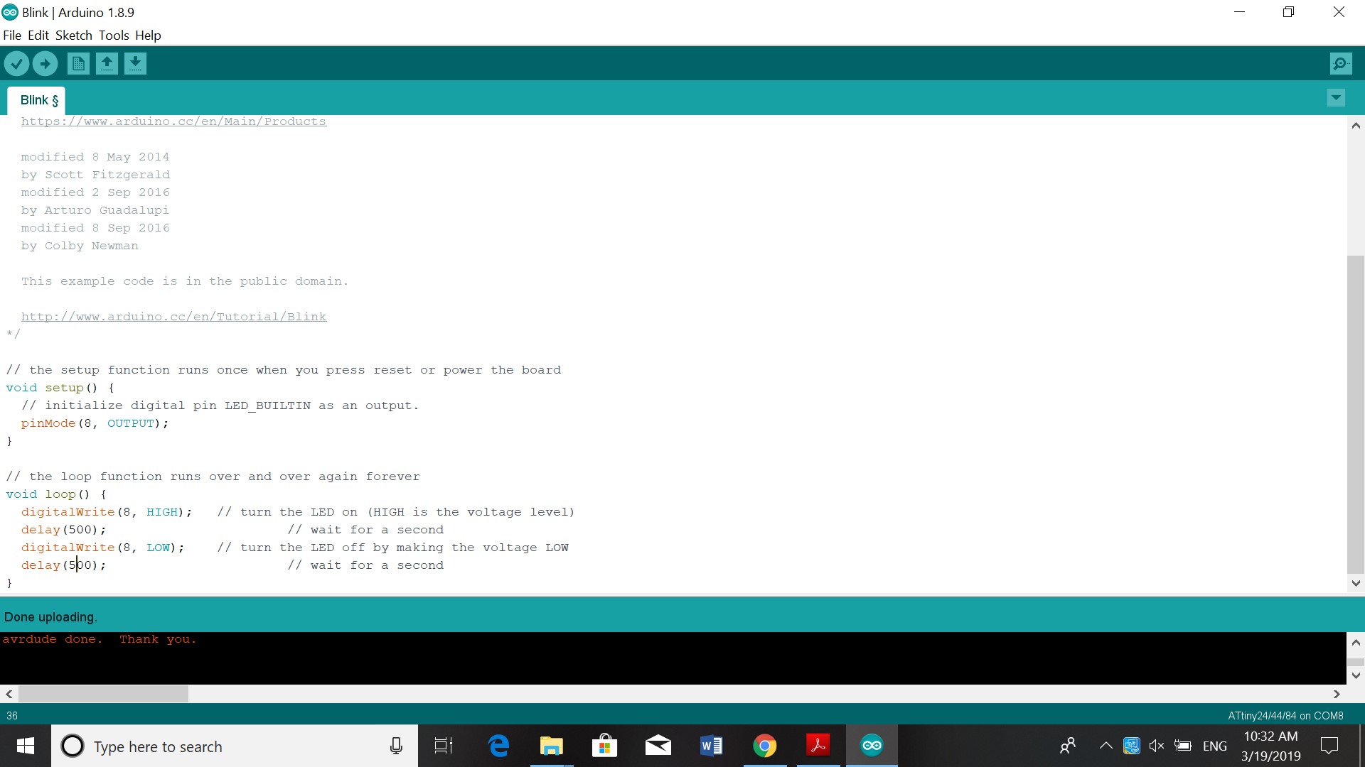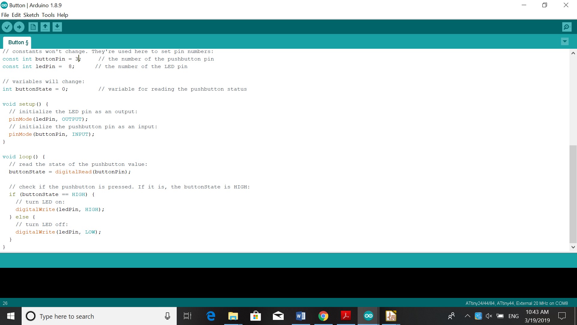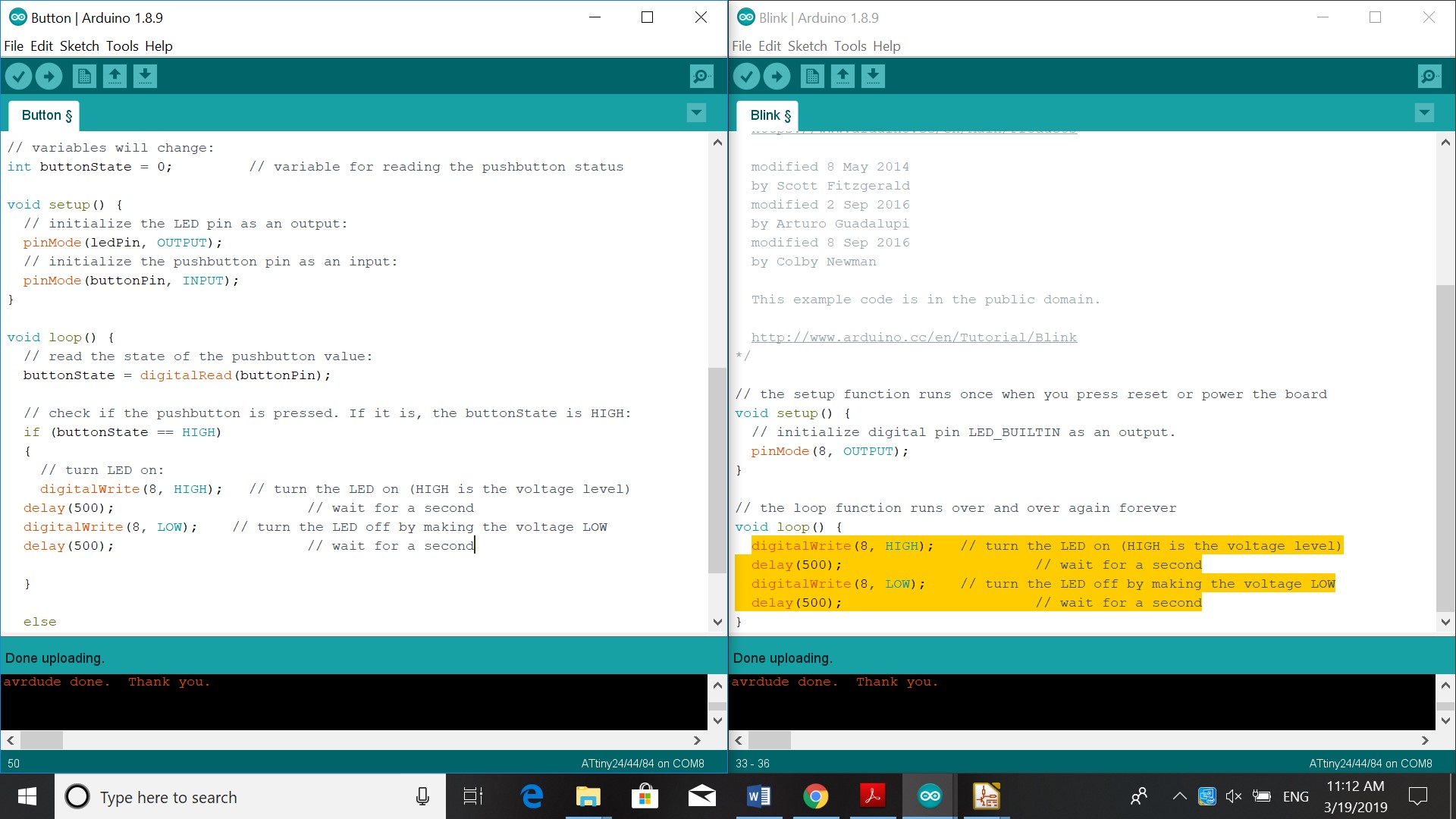 This week we had to work on reading this Data sheet. Program our board to do something, with as many different programming languages and programming environments as possible. So I used the Arduino as in week 7. In Arduino I changed the pin to 8 because the pinout of my board showed that and the delay to from 1000 to 500, so the light would blink. The information I used from the datasheet was the pinout for the Attiny 44. I had to see what pin to use to program the board to blink or use the button.