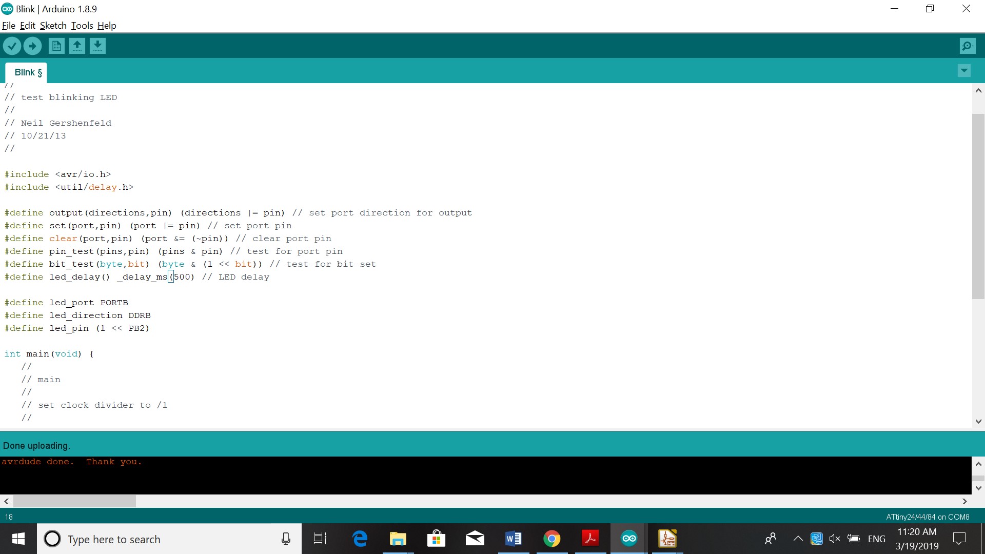 Third test was to load Neil’s code to our board and test it. So I copy pasted this link which is a blinking program written in C into Arduino. Using the datasheet, I searched for the pinout of the ATtiny 44 and the name of the pin. This was PB2. I then changed the pin to PB2 and ran the program. I also searched for the delay and changed that from 100 to 500.