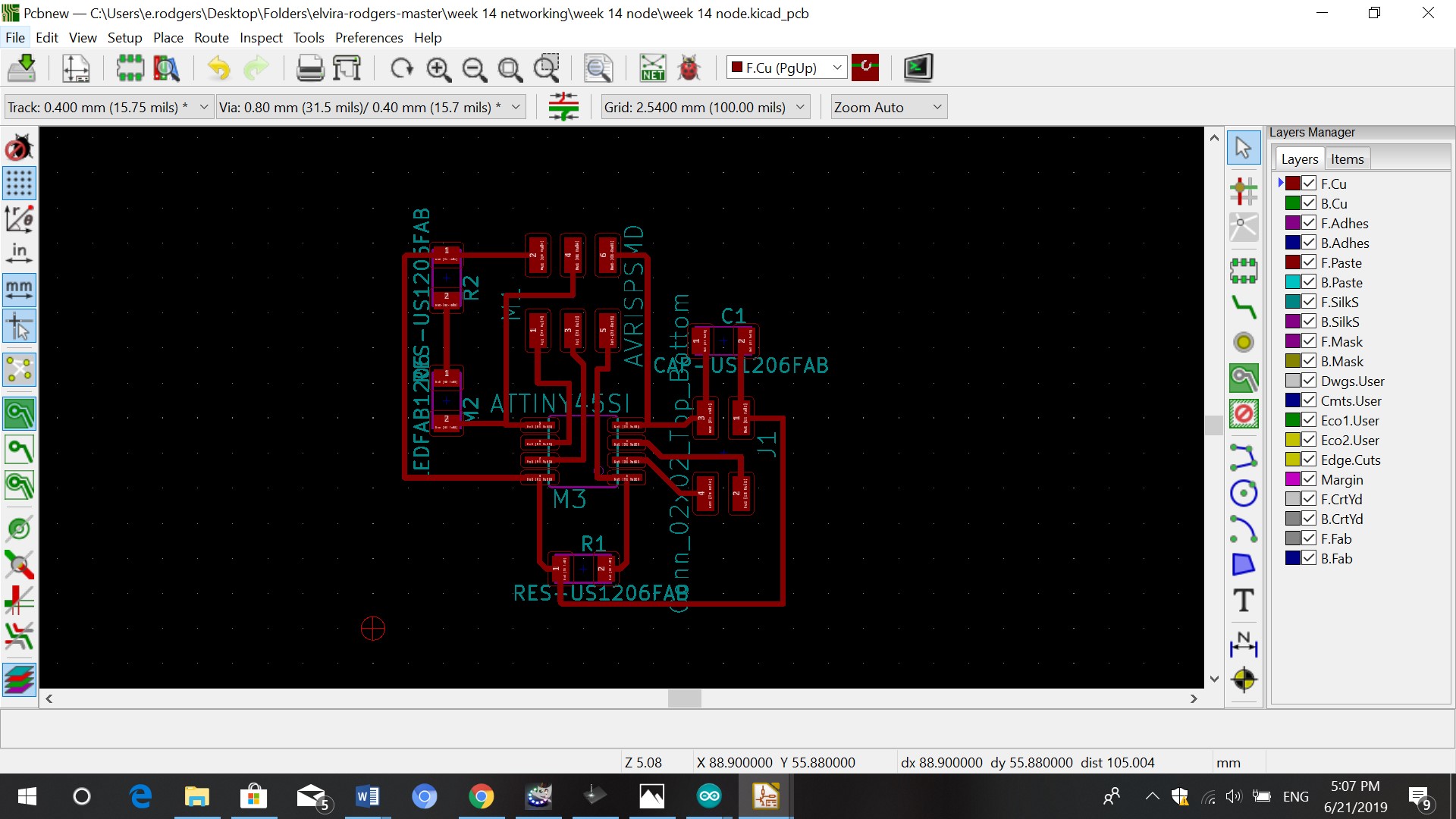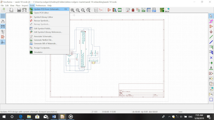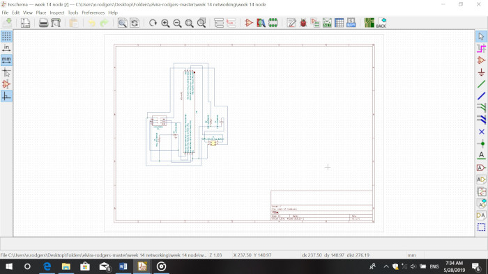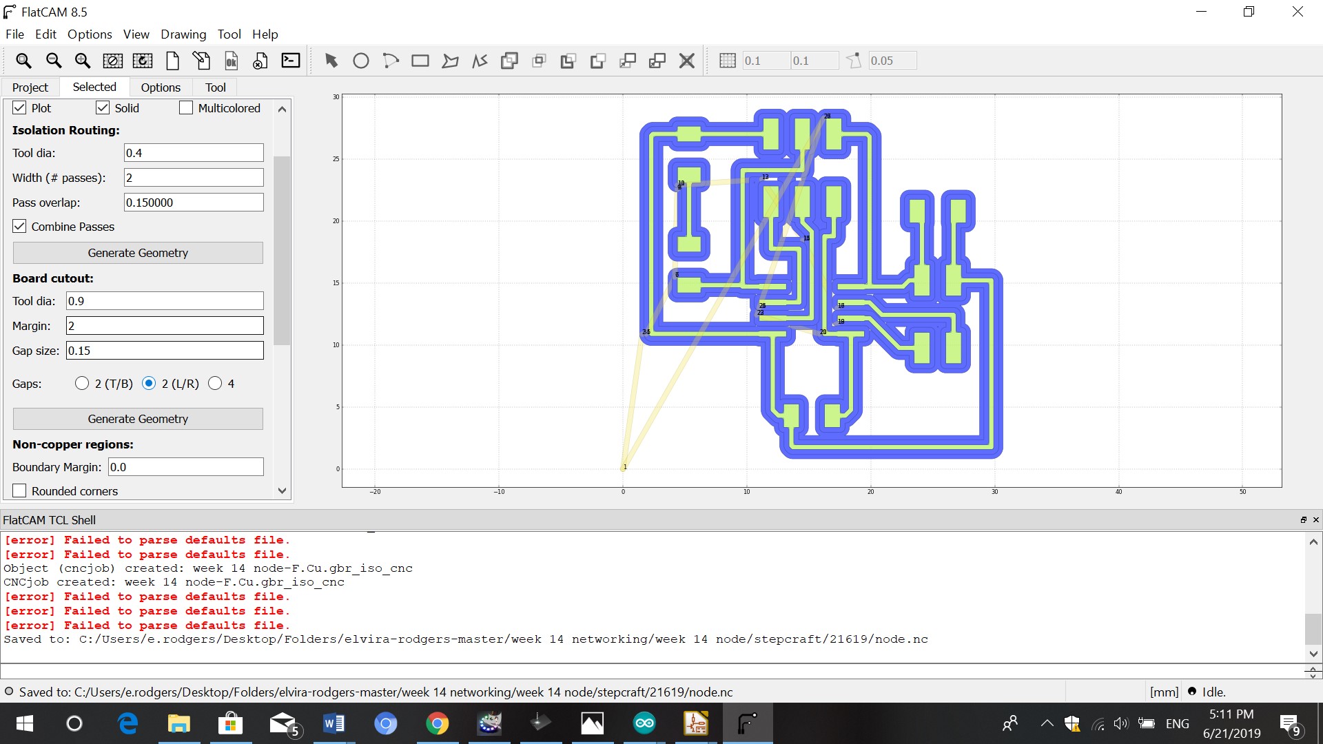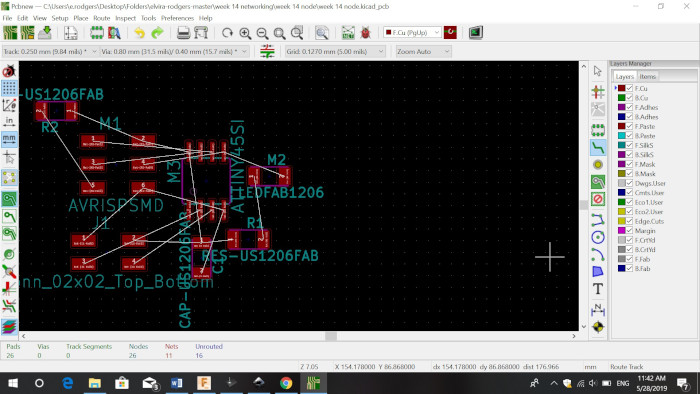 I milled the boards using the Stepcraft. Using WinPC-NC I set the coordinates for the machine. I then soldered the components unto the boards. For one of the traces for the node, I used a jumper cable because I couldn’t connect the trace in KiCad.