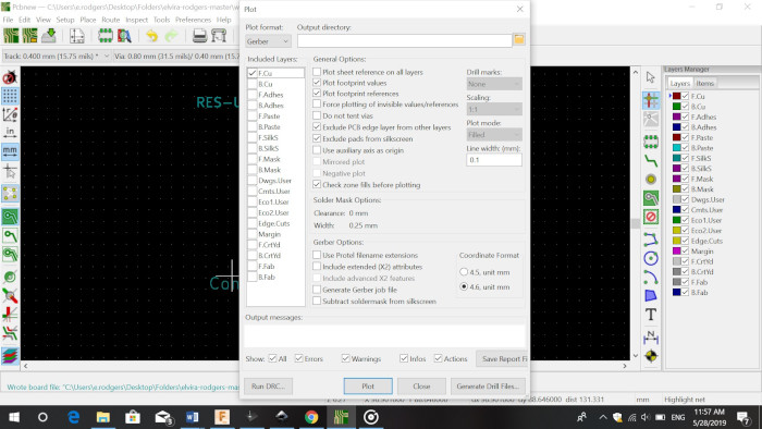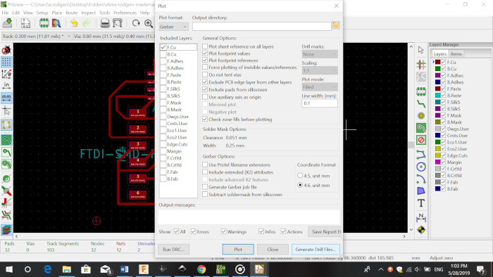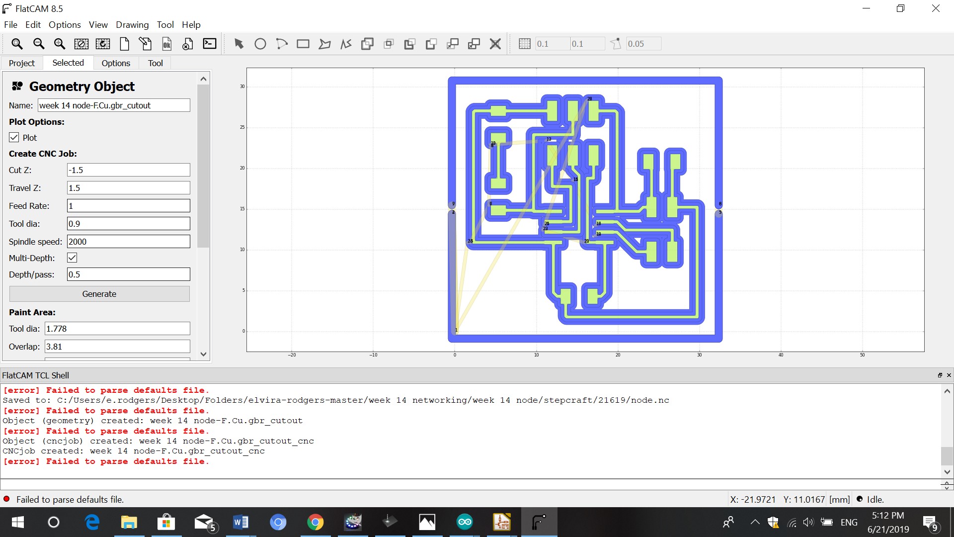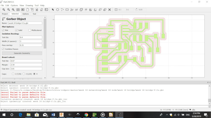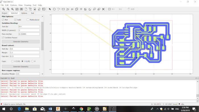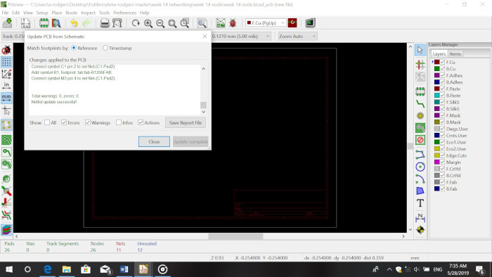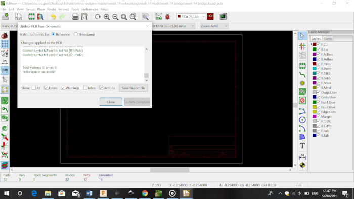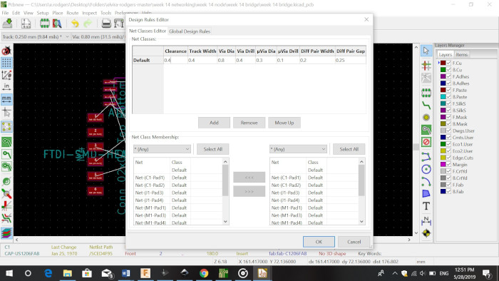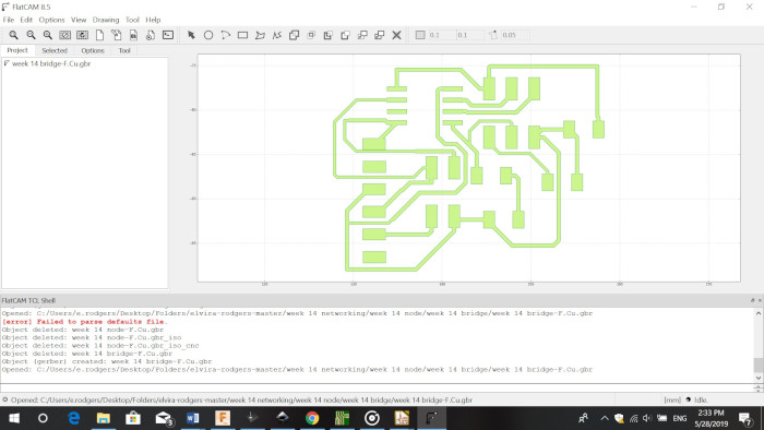 I milled the boards using the Stepcraft. Using WinPC-NC I set the coordinates for the machine. I then soldered the components unto the boards. For one of the traces for the node, I used a jumper cable because I couldn’t connect the trace in KiCad.