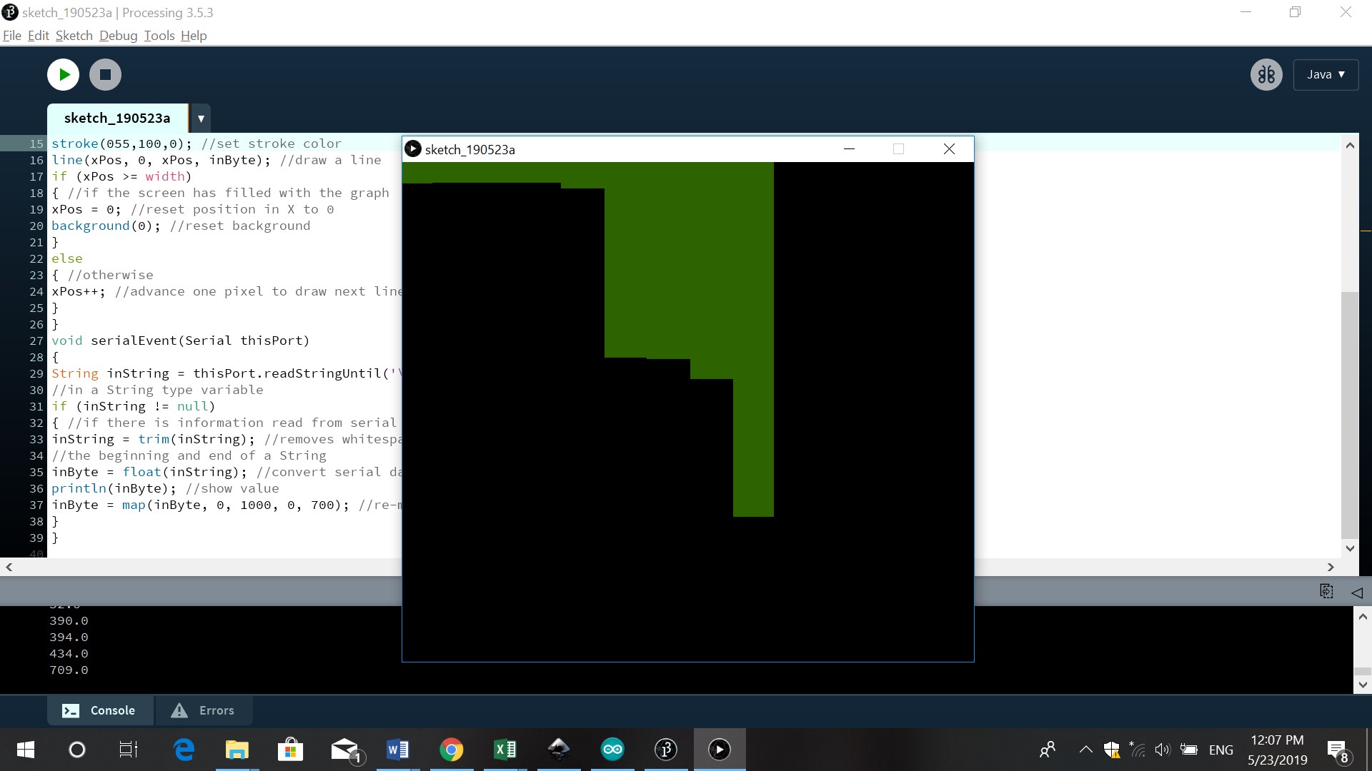 My interface shows my input board turning serial into string, which means the serial numbers will be displayed as a graph and the bars of the graph will change according to the light reflecting on the board.