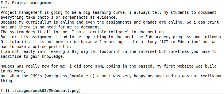 Project management is going to be a big learning curve, i allways tell my students to document everything take photo’s or screenshots as evidence. Because my curricullum is online and even the assignments and grades are online. So i can print out and there is no need for me to document. The system does it all for me. I am a terrible rollmodel in documenting But for this assignment i had to set up a blog to document the Fab academy progress and follow a Git tutorial, it is not new for me because 2 years ago i did a study “ICT in Education” and we had to make a online portfolio. I am not really into leaving a Big digital footprint on the internet but sometimes you have to sacrifice to gain knowledge.
