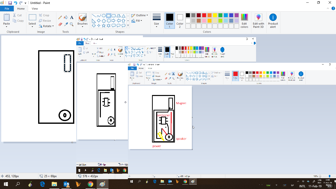 With Paint, I did a basic general sketch of my project in order to start forming the idea of how it will look like. There I added possible locations for the speaker, the micro controller and the solenoid. I just used rectangles, circles and lines.