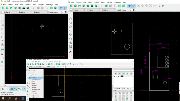 In LibreCad you can work with exact dimensions, so I tried to make a more detailed sketch, with possible dimensions for the final project. Its easy to use because you work with rectangles, circles and lines, and the grid allows for easy sketching.