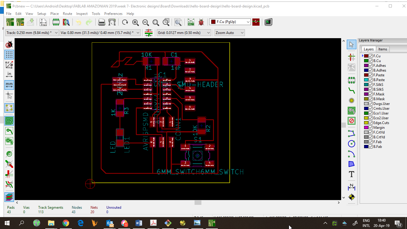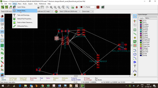 Before designing the PCB, the design rules must be defined. For my board I set the Track width to 0.35 and the Clearance to 0.25.