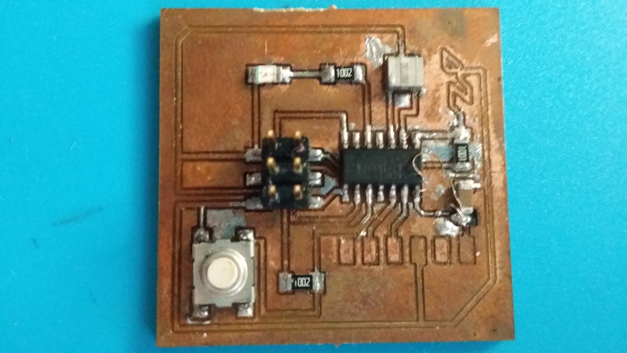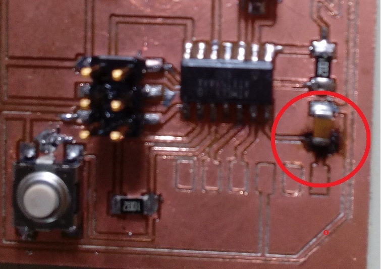 because we run out of milling bits i could not remake the board and i had to make a bridge waiting for new bits The bridge was made from the capacitor to the first pin of the controller :(