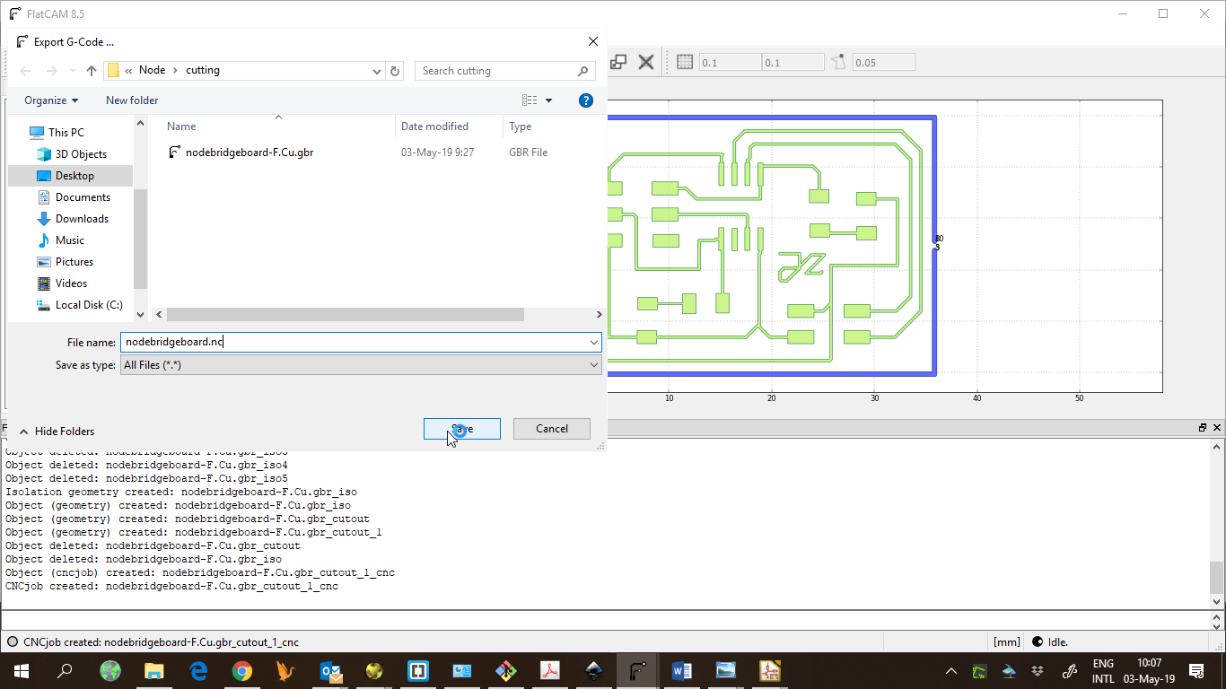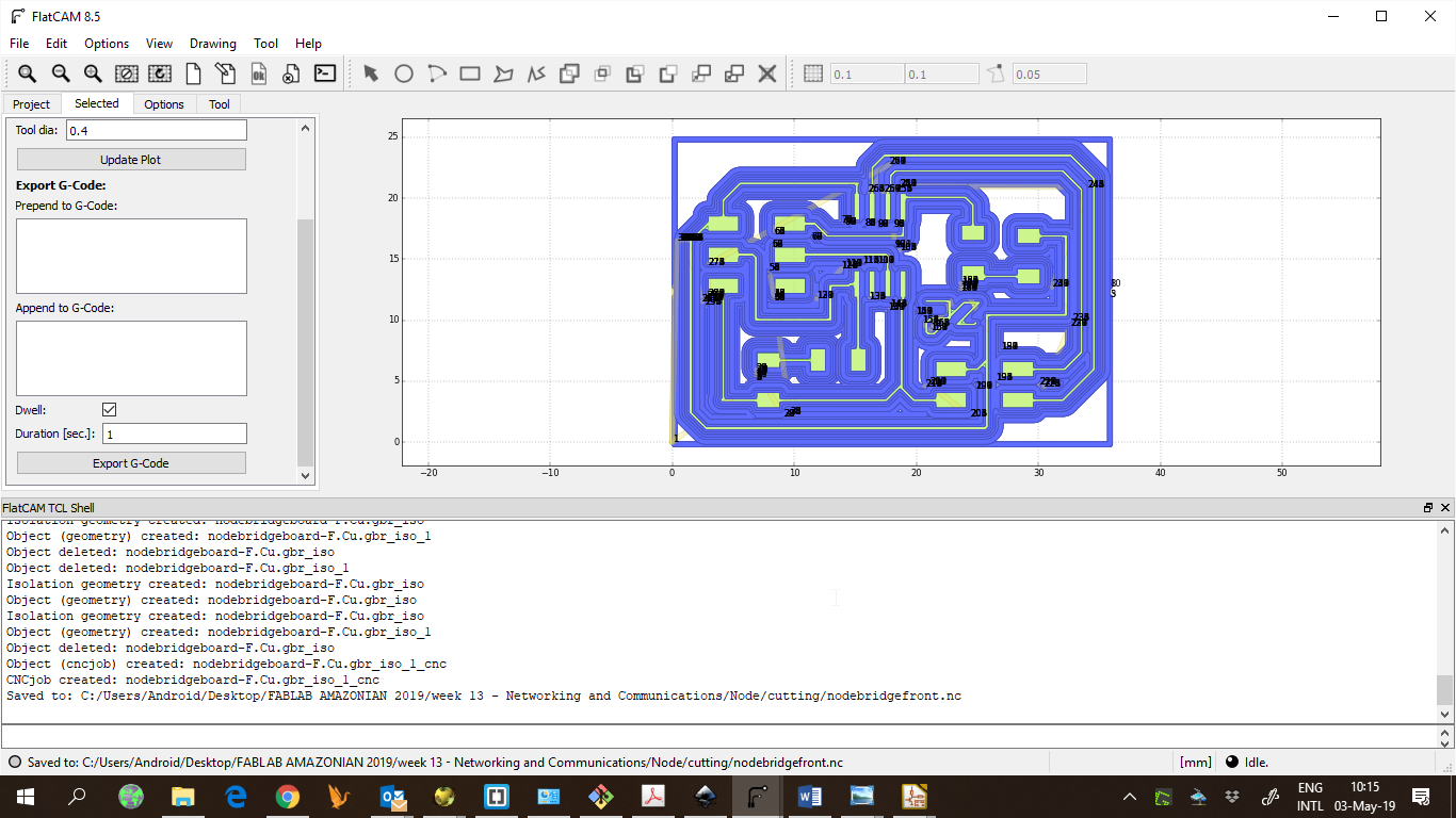 Parameters are: cut z: -0,15, feedrate: 60; tool dia: 0,4, spindle: 7000.