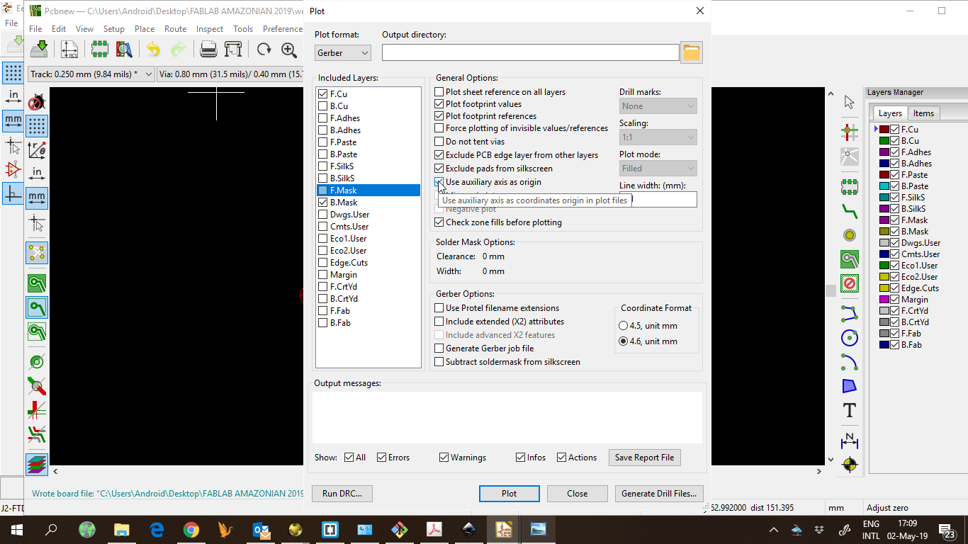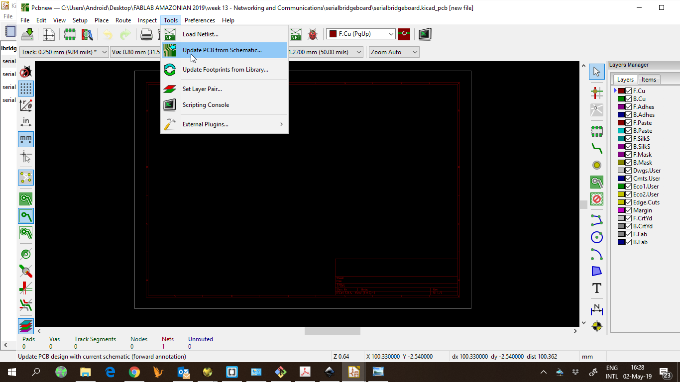 When finished, I annotated the components, assigned footprints and generated the netlist. Then, to pcbnew.