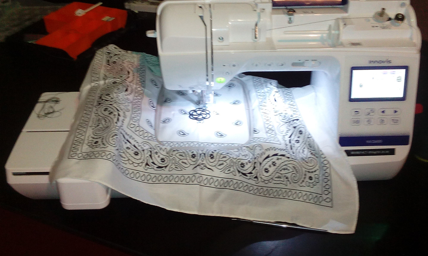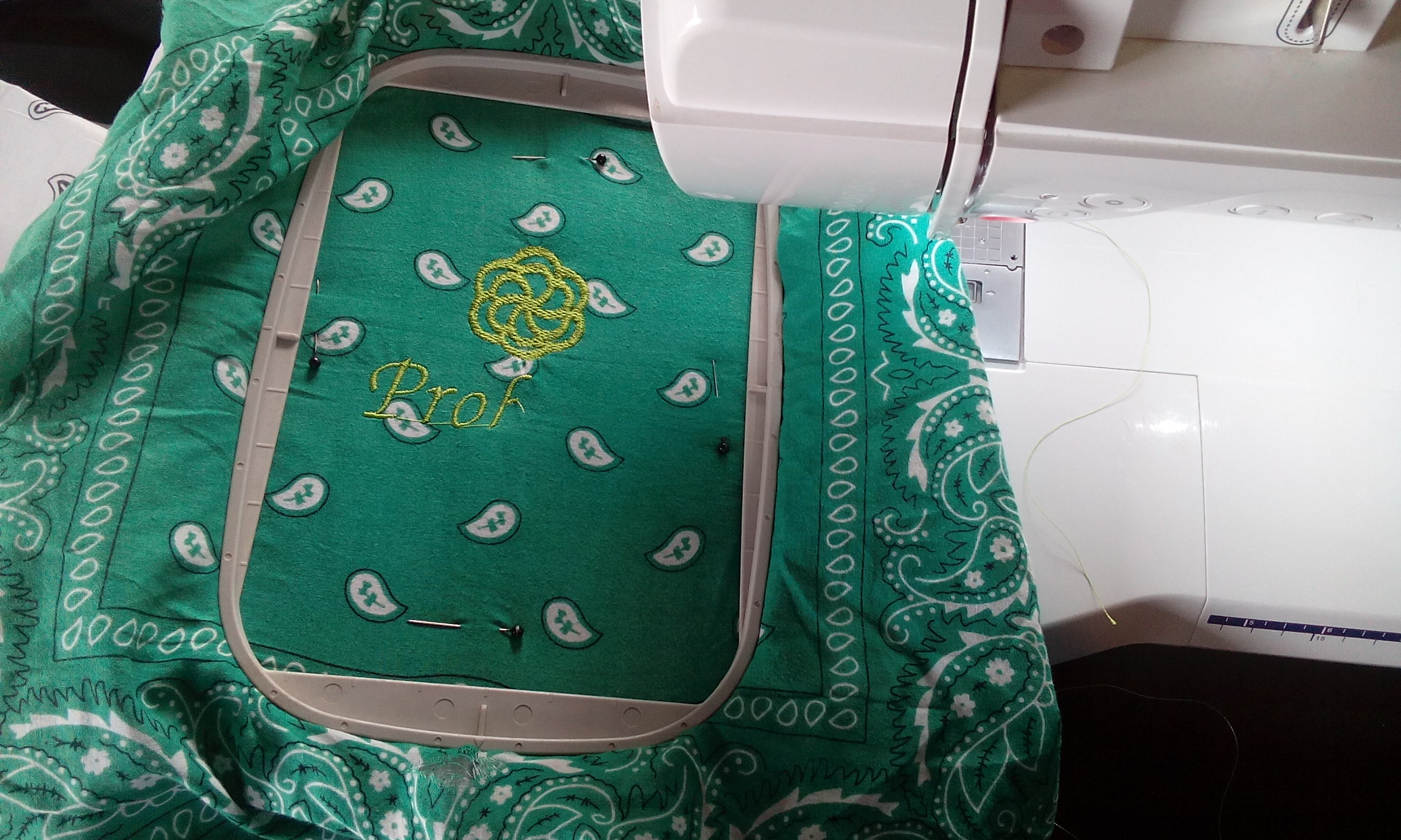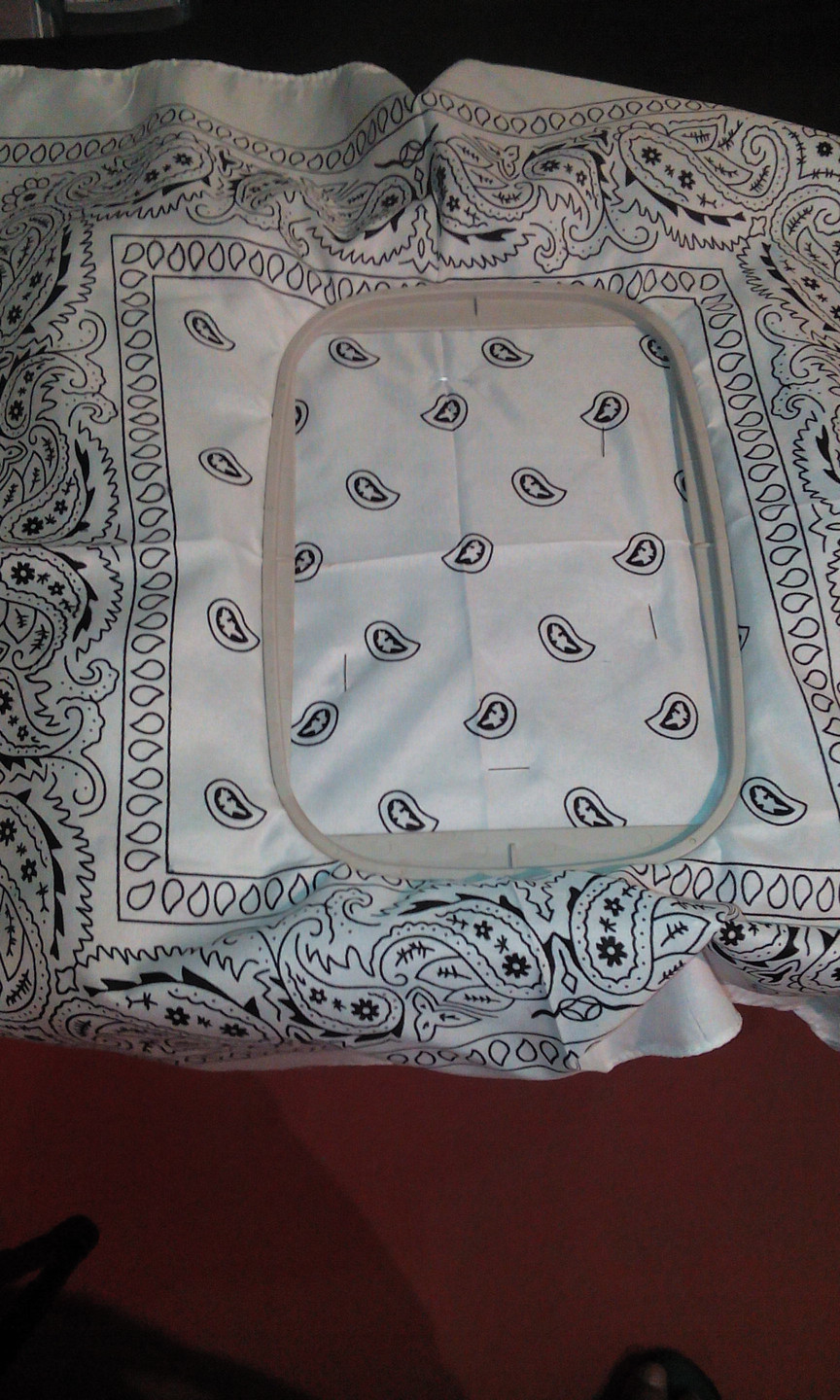 Next step is to get your cloth in my case a handkerchief ready into the special frame, there is a limit in how big the design can be. You have to use a another cloth on the back especially if your fabric is to thin