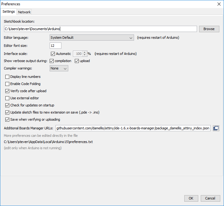 - Install ATtiny support into Arduino at ‘File> Preferences> Additional Boards Manager URLs:’. Paste https://raw.githubusercontent.com/damellis/attiny/ide-1.6.x-boards-manager/package_damellis_attiny_index.json.