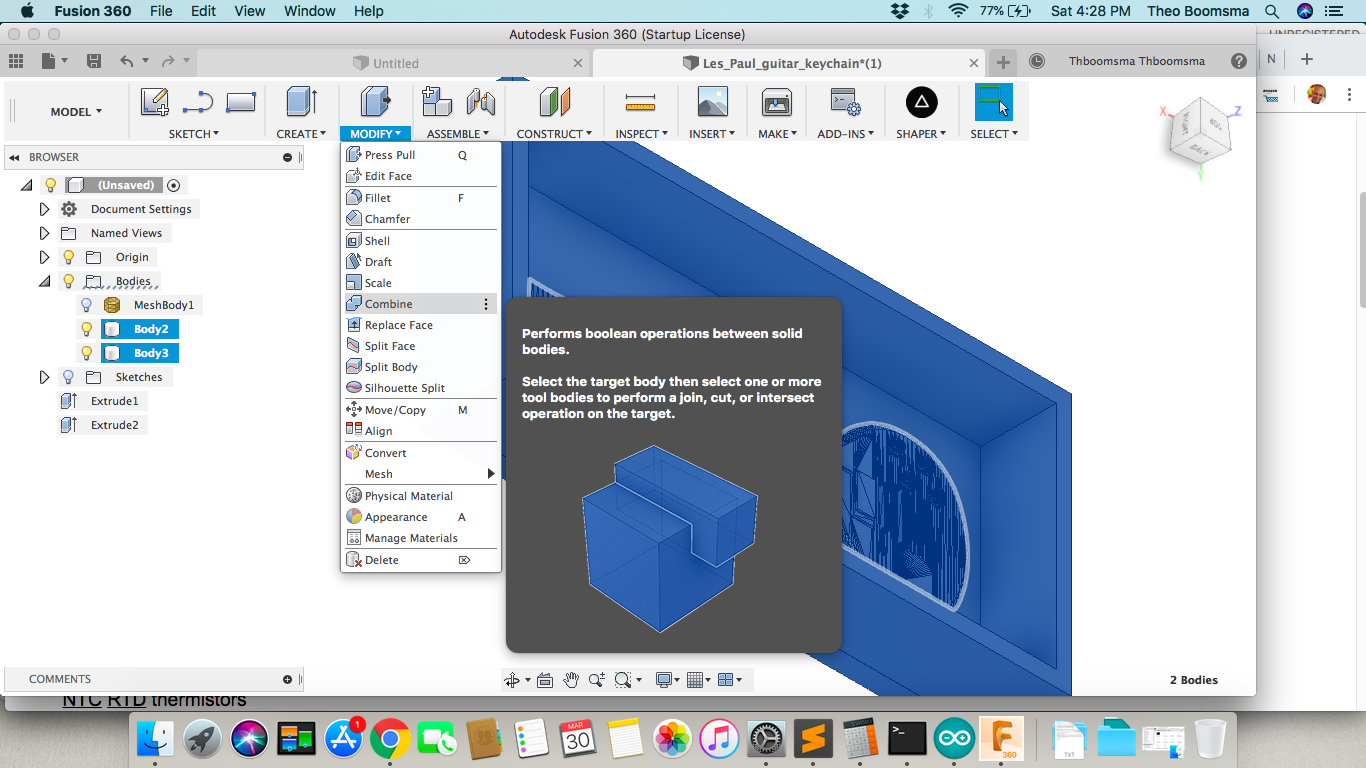 Now we combine the bodies into a single body. The operation works only if the 2 bodies literally collide so we had to lower the guitar somewhat into the box bottom for this to work.