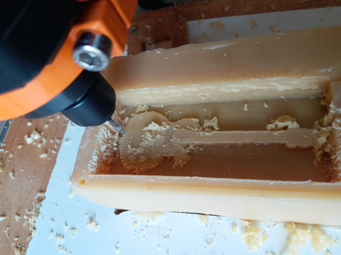 I used Stepcraft D840 with UCCNC software to perform the Positive mold milling first in a block of soap. Performed a rough cut with 3.75 mm straight end mill and horizontal fine cut with a 1.5 mm ball end mill.