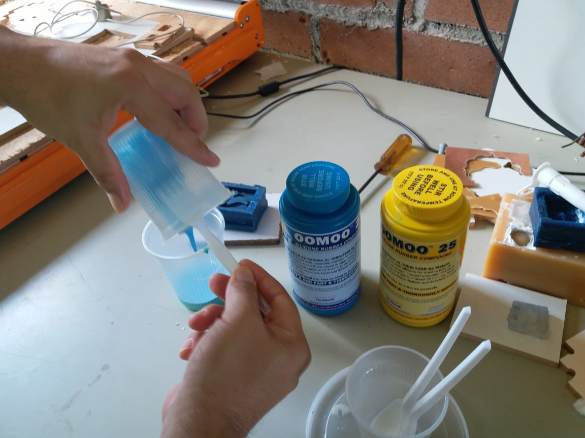 For casting we used OMOO silicone rubber to generate Negative Mold from the positive that we created with CNC milling. It’s a 2-component rubber compound that has to be well mixed and applied within a few minutes. After this it takes about 60-90 minutes to cure.