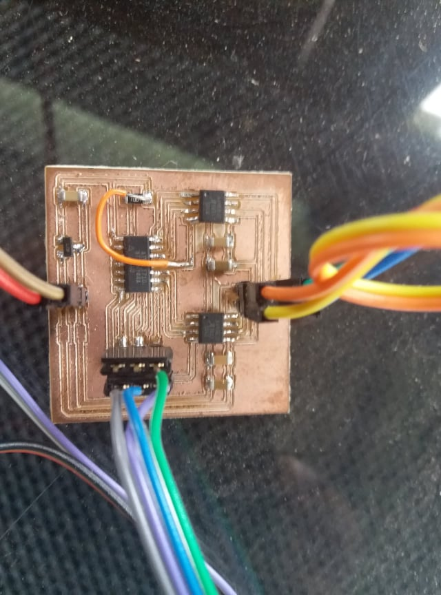 The motor drivers we implemented were based on the HelloStepper board design with the ISP headers installed on them. We tweaked the design to use Serial communication over the ISP header, so both steppers are tied to the same serial UART bus listening to the same messages coming over but each only responding to his own relevant (part of) messages.