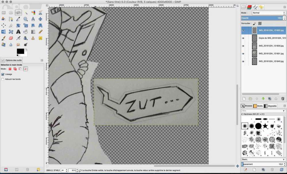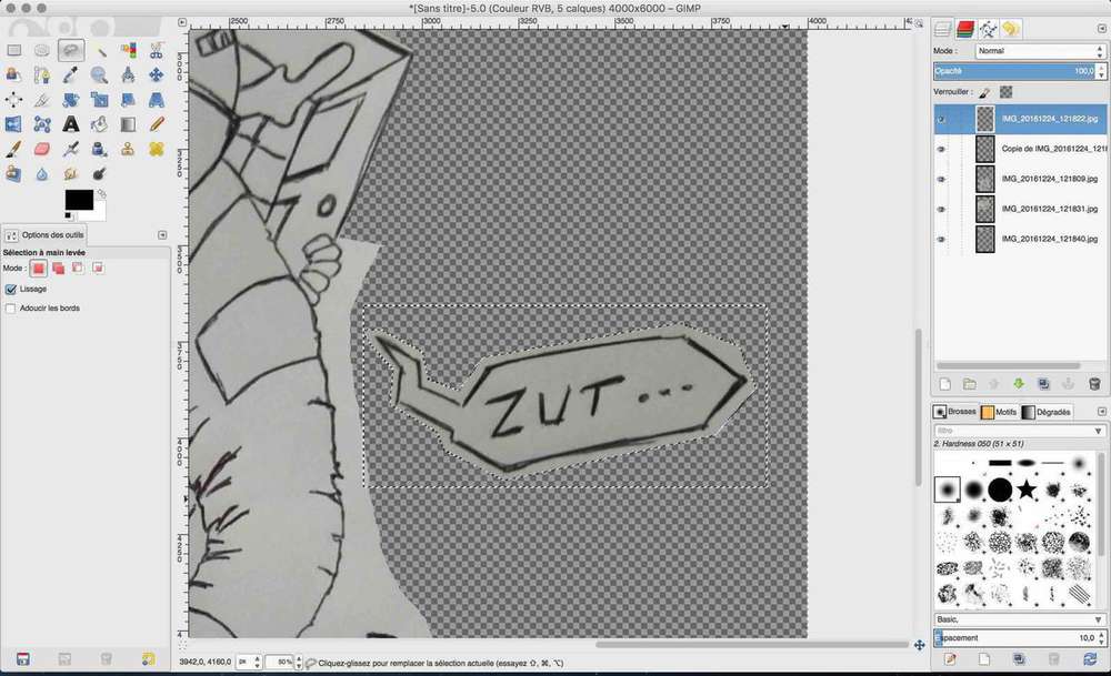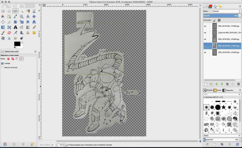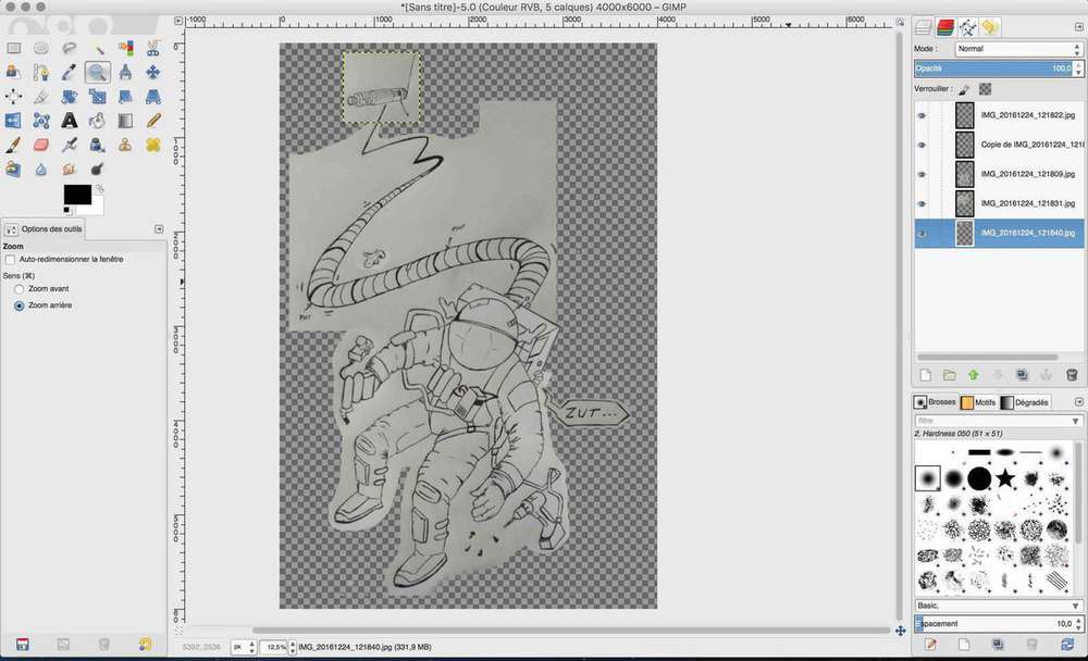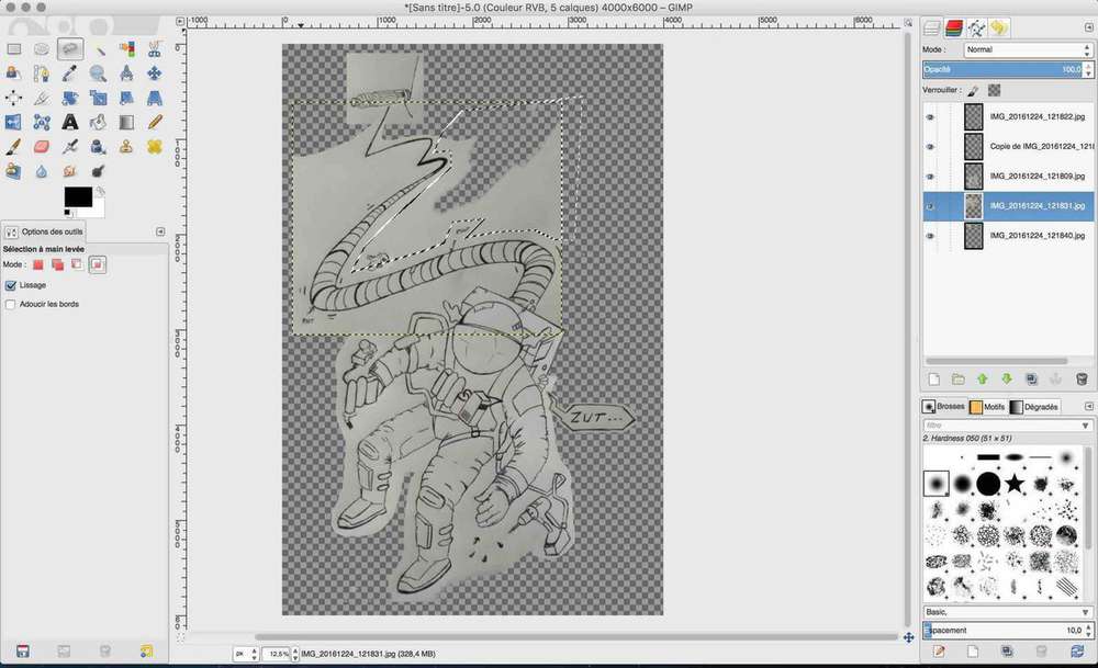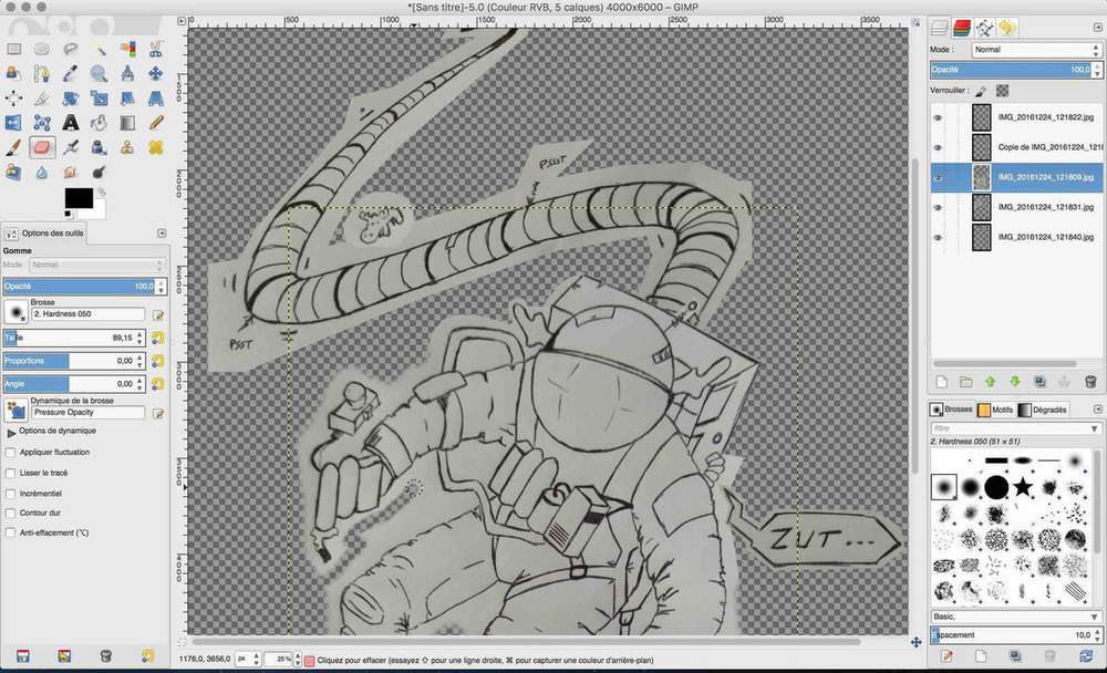 The first step in gimp is to import all the separated drawings and assemble them into only one drawing. After that, I has to erase some parts of the drawing to clean it up.