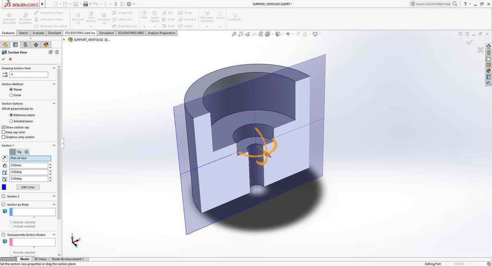Mostly when you are working on revolution parts, you will need to see the inside of your design. The section view can help you. You can select a plane to virtually “cut” your part to see the inside of it. Very useful !