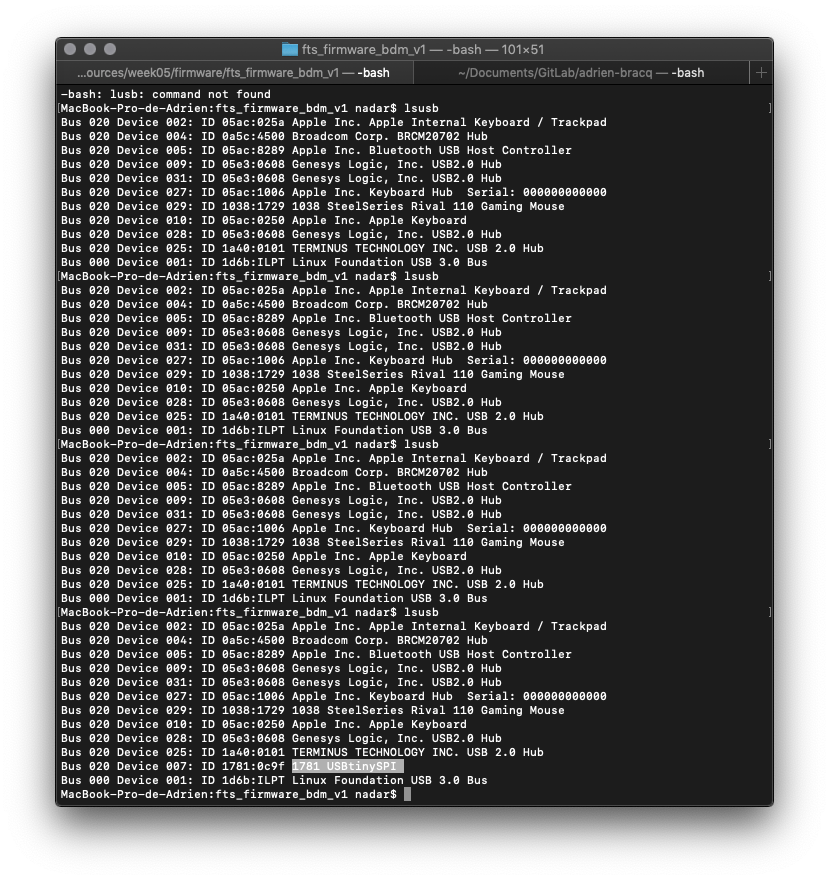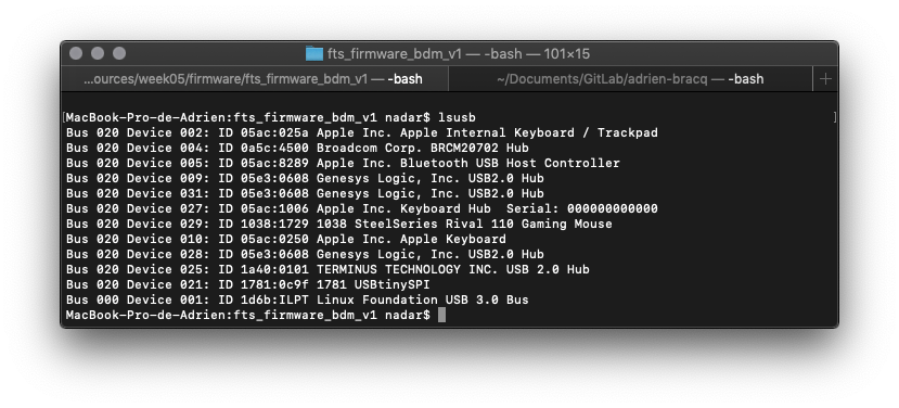 It works but I didn’t manage to find the board into the usb list of MacOs after that. So I installed lusb which is the equivalent of lsusb on linux. So, when I use the CL lsusb the terminal show me a list of all the USB port plug into my MAC.