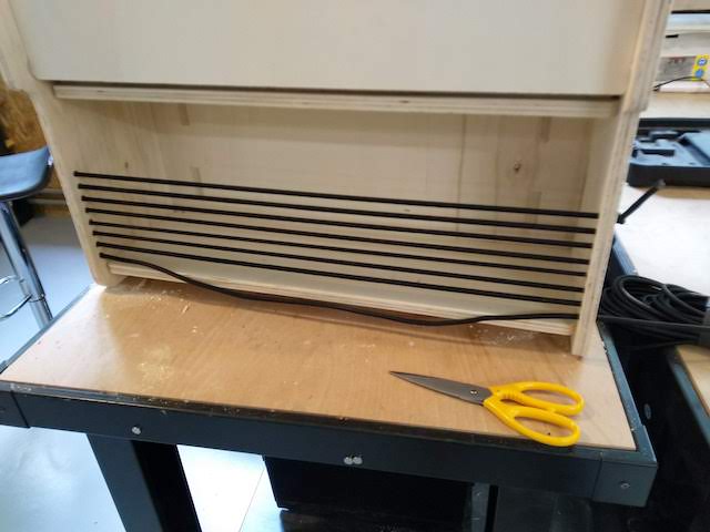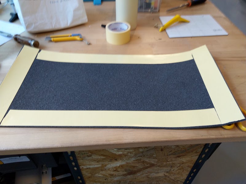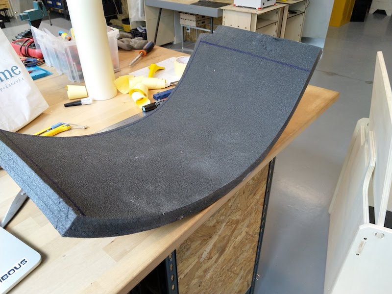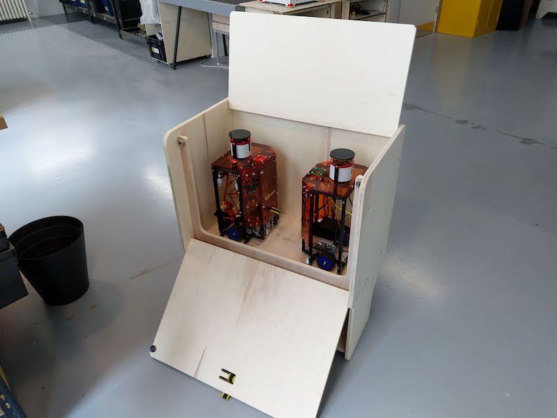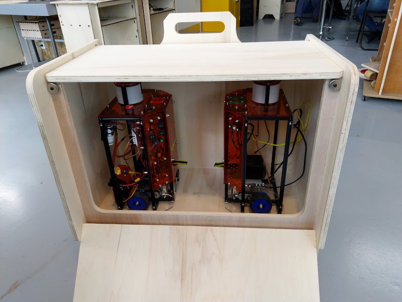 The foam will maintain the robots inside the box. For the bottom of the box, I use rigid foam that I will cut to the robots dimensions when they will be finshed. The foam has been pasted with double-sided tape.