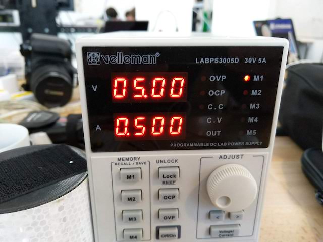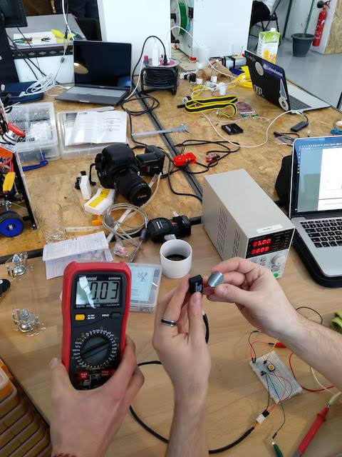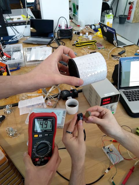 The idea is to quickly test the sensor with the mirror. So I manually took the mirror in one hand and in the other hand the sensor. Normally, when nothing is detected, I’ve to measure 0V. And when I put a reflective surface near the mirror, the sensor should detect it and the voltage should be near 5V.