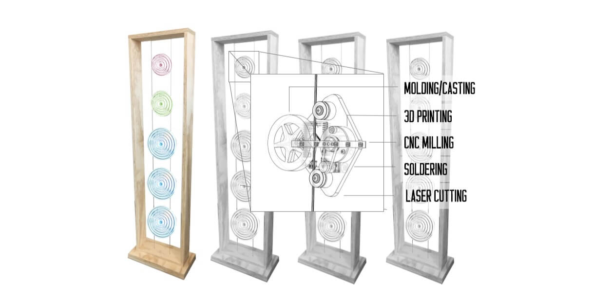 In Computer Controlled Machining Week I designed what I am calling the Power Tower. It is a 8 foot tall plywood tower cut on the shopbot out of one sheet of 3/4” plywood. Metal cables stretch the height of the tower and are hooked to a 5 volt power supply. One cable is connected to the negative and one cable is hooked o the positive.