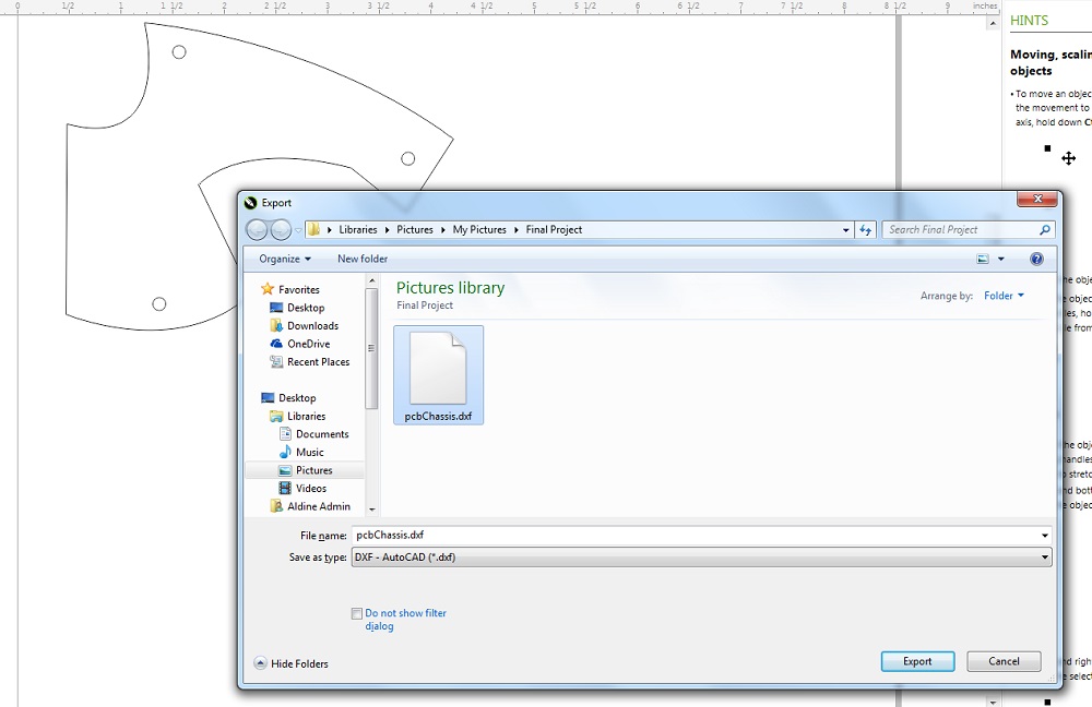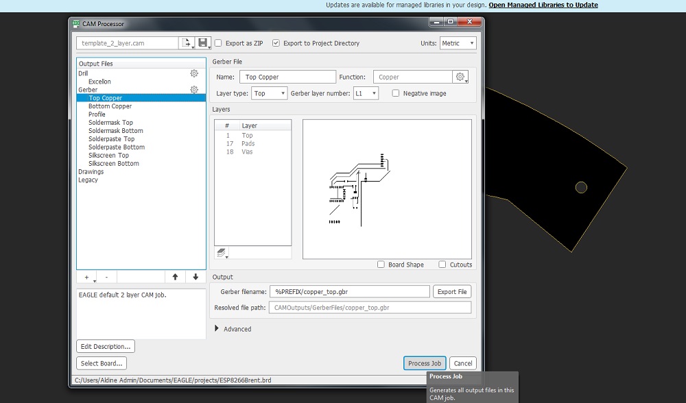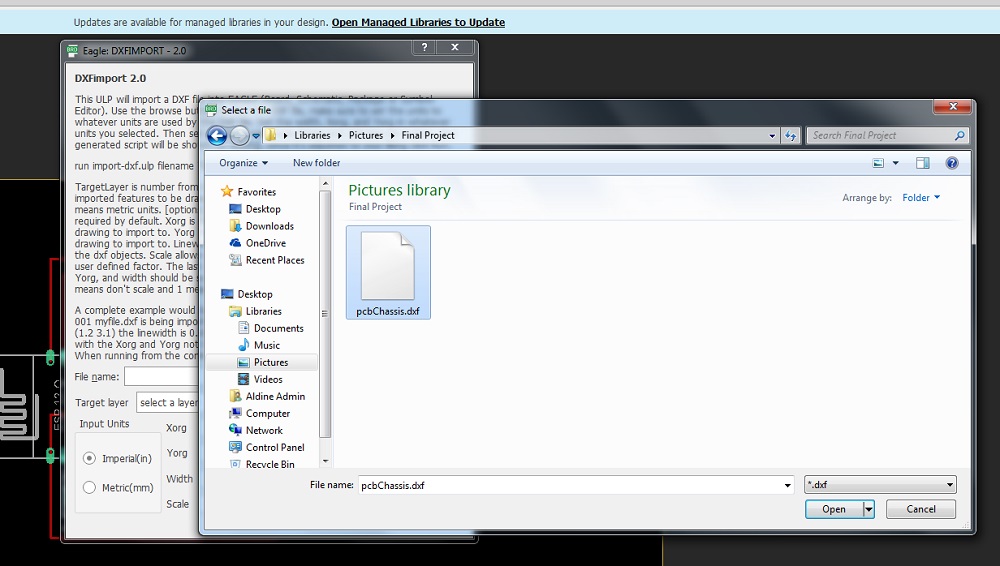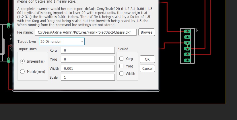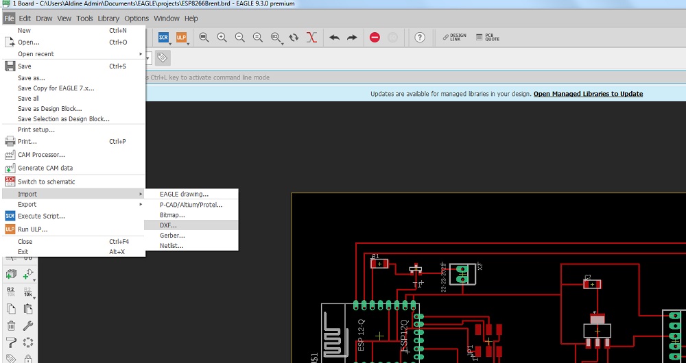 In Eagle, I opened the ESP8266 board from Week 14 and deleted the outline from the Dimension layer. Then, I imported the DXF saved from CorelDRAW by going to File/Import/DXF