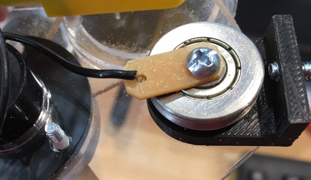 My second attempt is to cut a little piece of copper clad that anchors to the screw holding the bearing in but also touches the outside of the bearing. This solution is perfect because it allows the bearing to spin while conducting electricity.