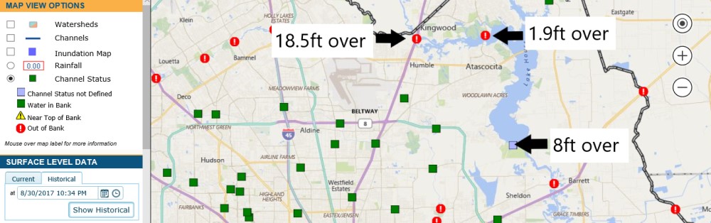 Being new to Houston, I surprised to see where the flooding occurred. During the storm parts of the lake were blocked by forming sandbars. My house did not flood since it is only a few hundred yard from the dam. My in-laws’ house flooded several feet deep because the water pooled deeper behind the sand deposits.