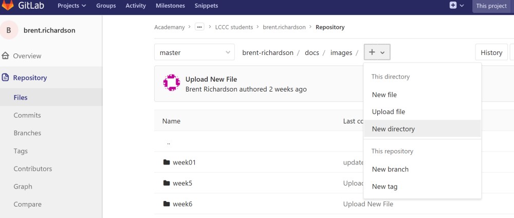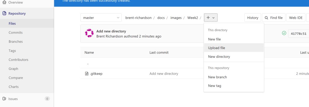 I like that everything can be done through the browser but it is time consuming to upload images. After navigating to images/Week2/ I clicked the + button at the top of the screen and clicked “Upload file”. The challenge is that you can only upload one file at a time.