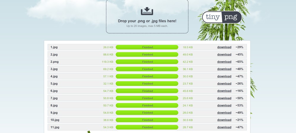 Once the images were saves to resonable size I uploaded them all to TinyPNG. You can see from the image how the online software compresses all the images significantly.